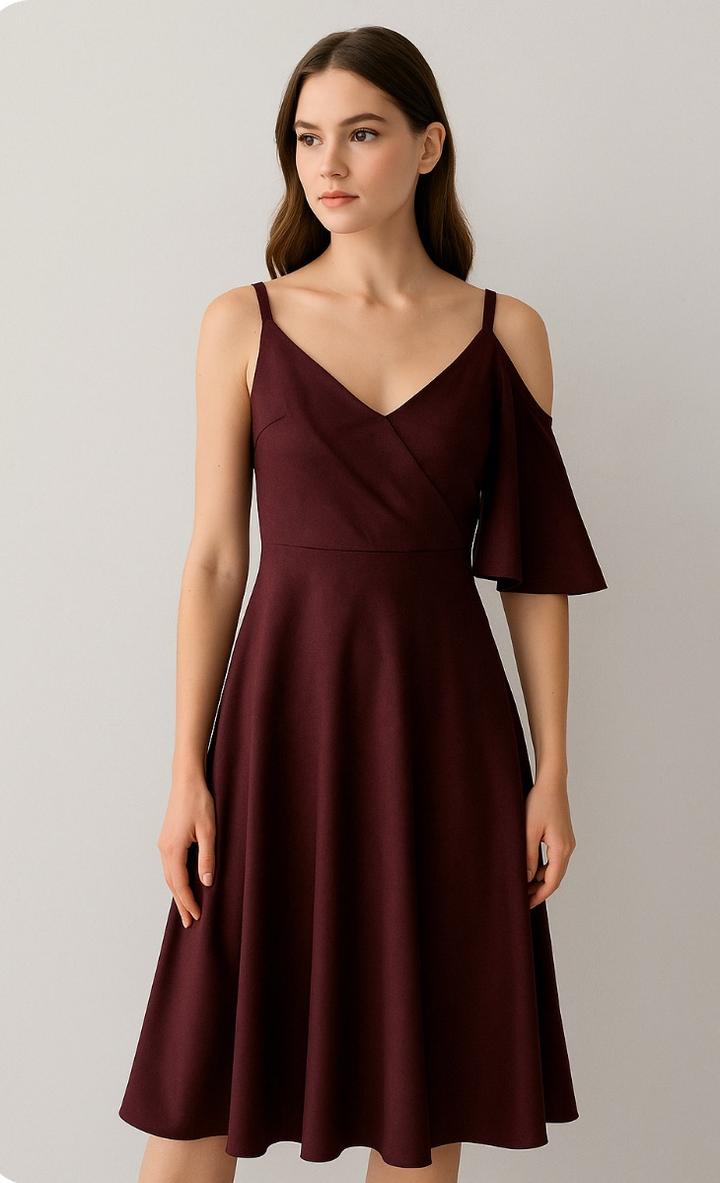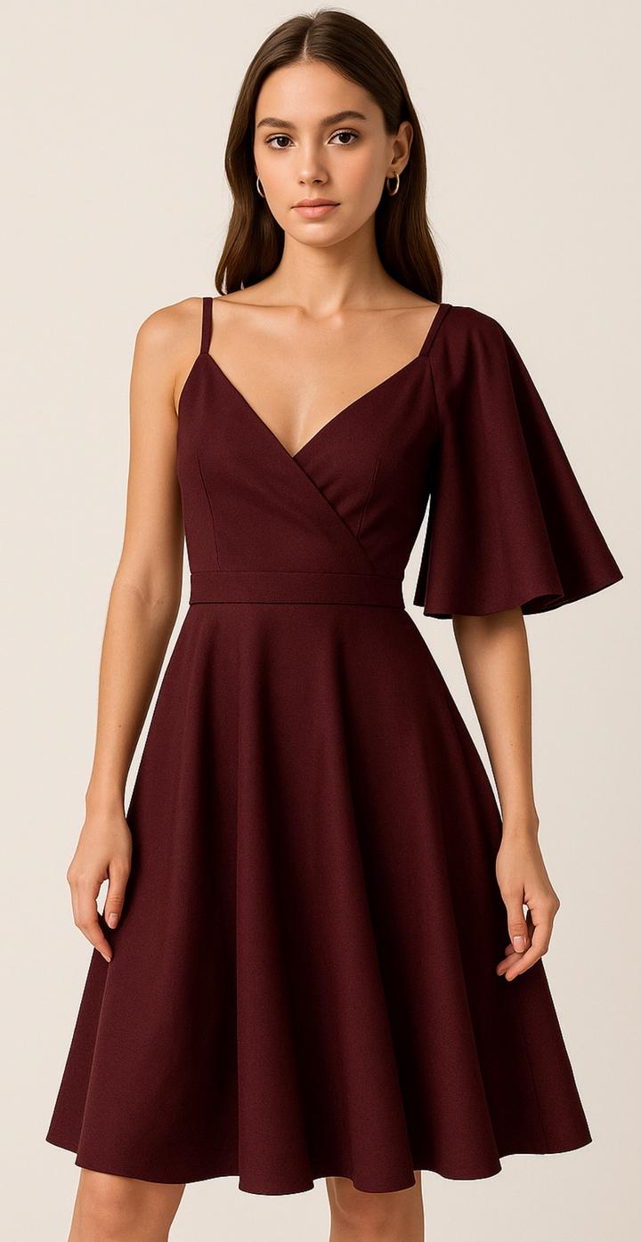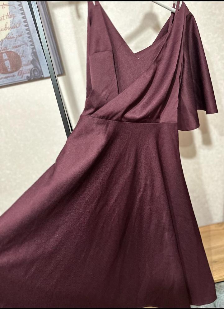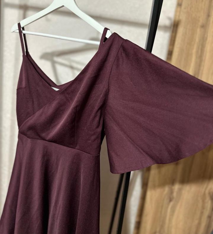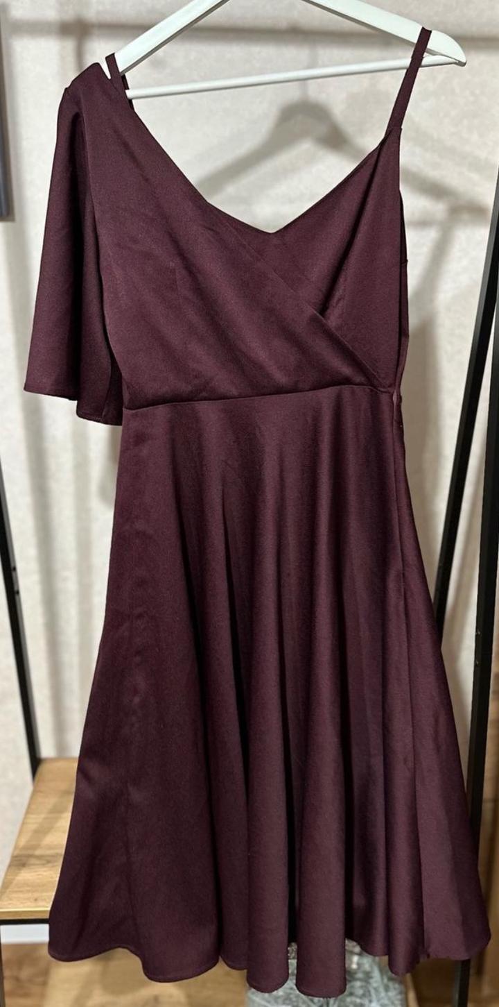 Элегантное платье Lichi в насыщенном винном оттенке. Глубокий V-вырез и тонкие бретели подчёркивают плечи, а асимметричный расклёшенный рукав добавляет стильной драматичности. Юбка А-силуэта мягко струится и формирует женственный силуэт. Платье выглядит эффектно и подойдёт для торжеств, ужинов и вечерних выходов. Артикул: 349822