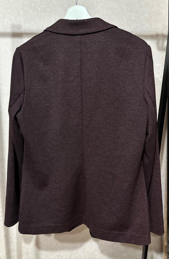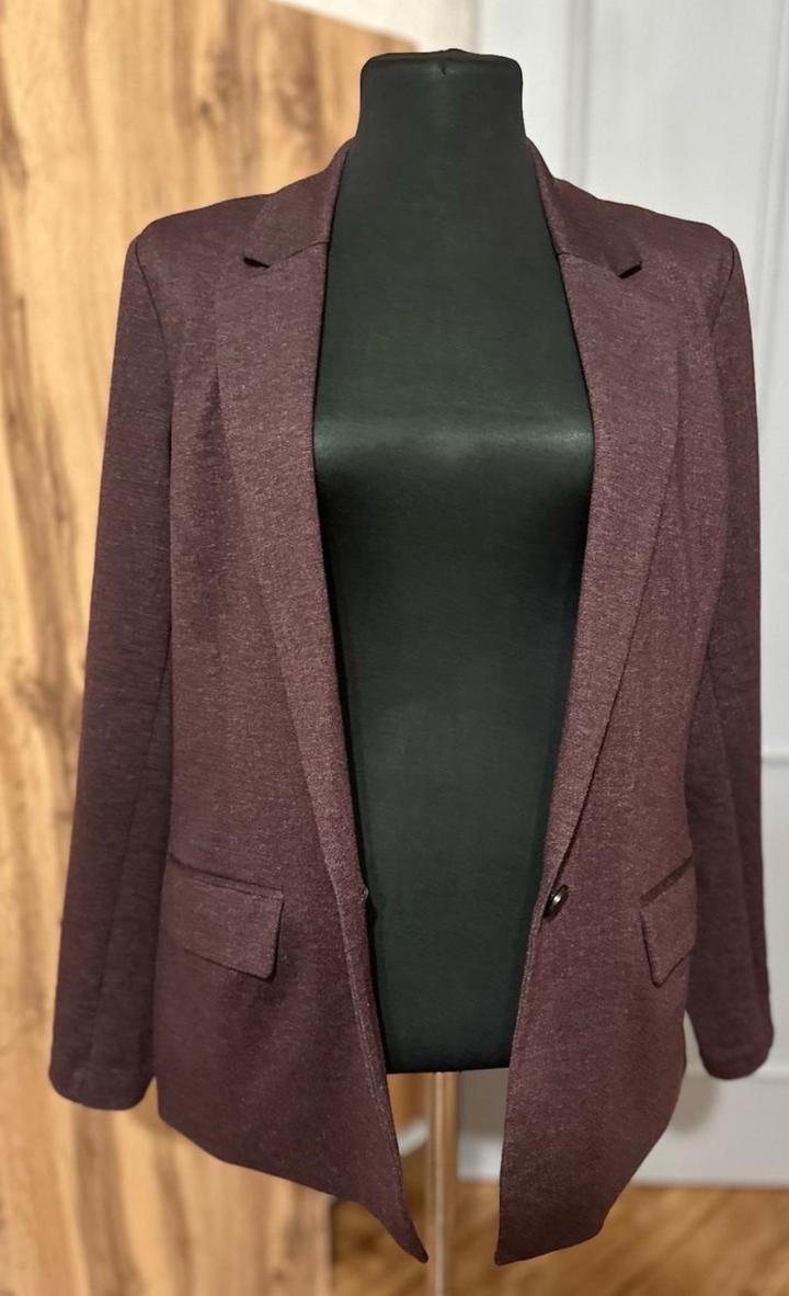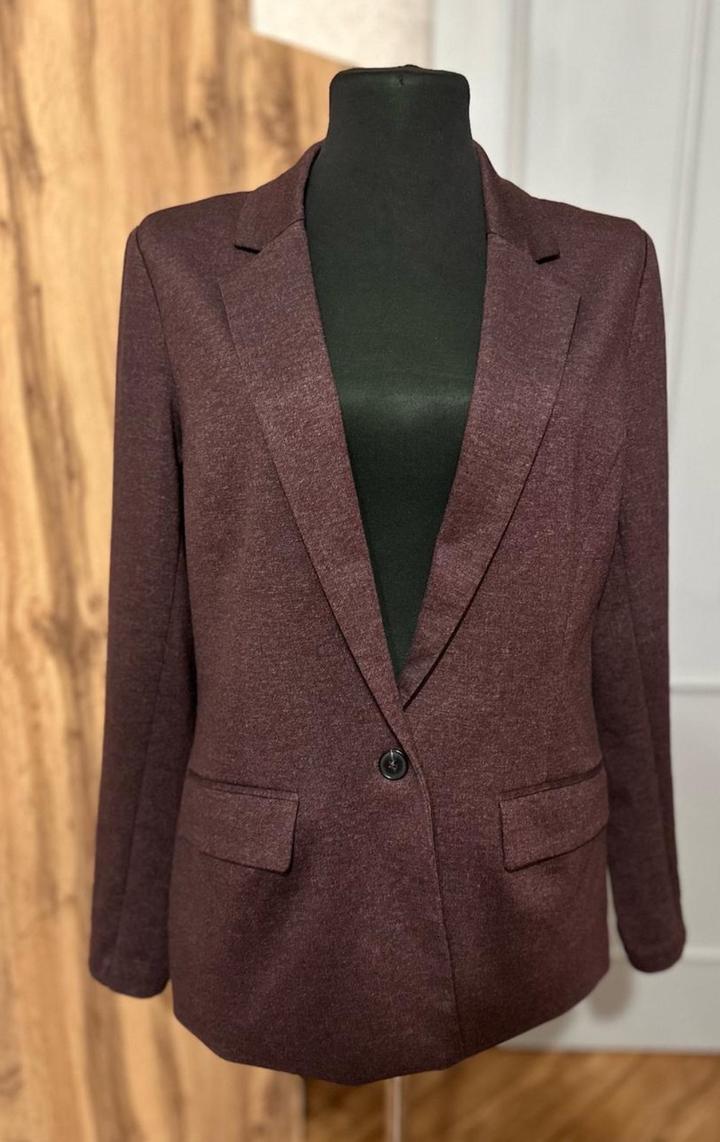 Жакет Tom Tailor в глубокoм бордово-коричневом оттенке — универсальная базовая вещь, которая подойдёт и под офисный стиль, и под повседневные образы. Изготовлен из плотной трикотажной ткани, отлично держит форму и очень комфортен в носке. Модель на одной пуговице, аккуратные лацканы, функциональные карманы. Носить можно как с джинсами, так и с платьями — смотрится дорого и аккуратно. В отличном состояни, без бирок. Размер M садится комфортно, ткань тянется, подходит на 44–46. Идеален Артикул: 349834