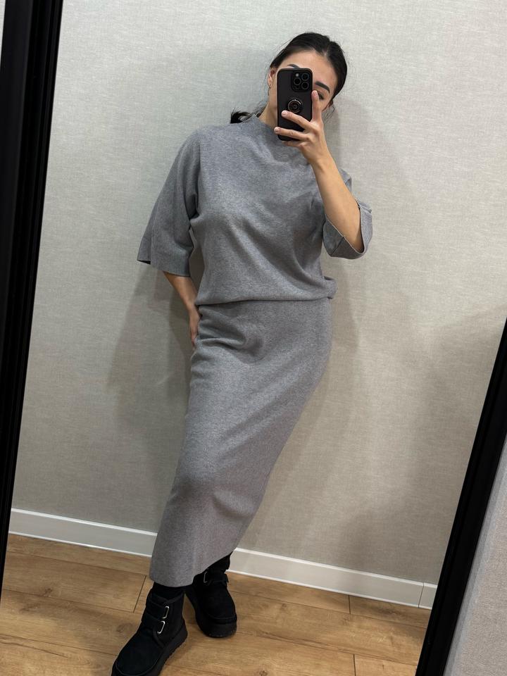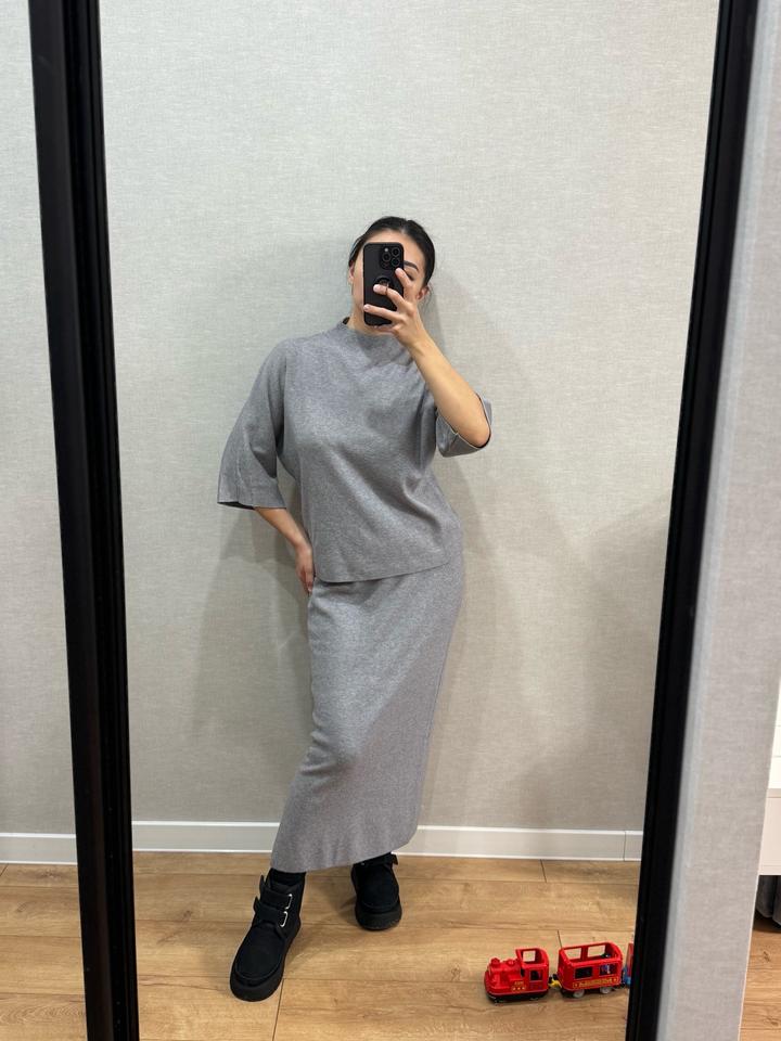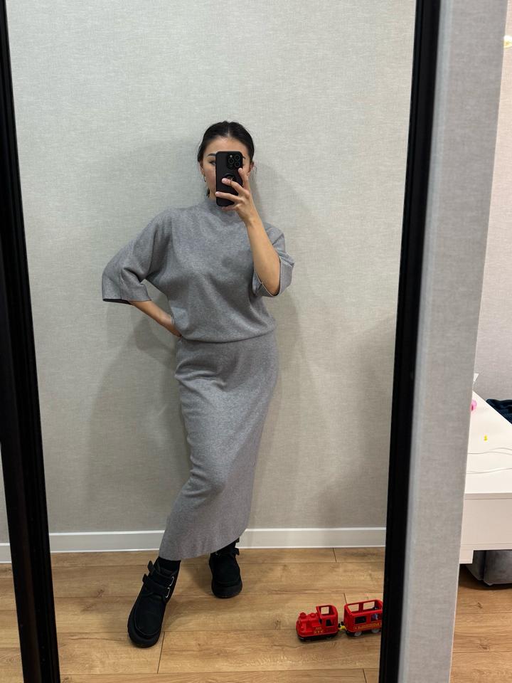Стильная трикотажная двойка: миди-юбка + кофточка “летучая мышь”. Цвет серый, размер М. мягкий, универсальный. Сидит красиво, подчёркивает фигуру. Состояние отличное. Один раз только одевалось. Артикул: 353653