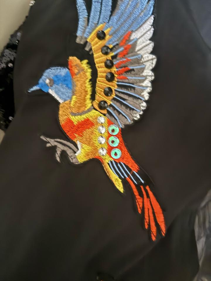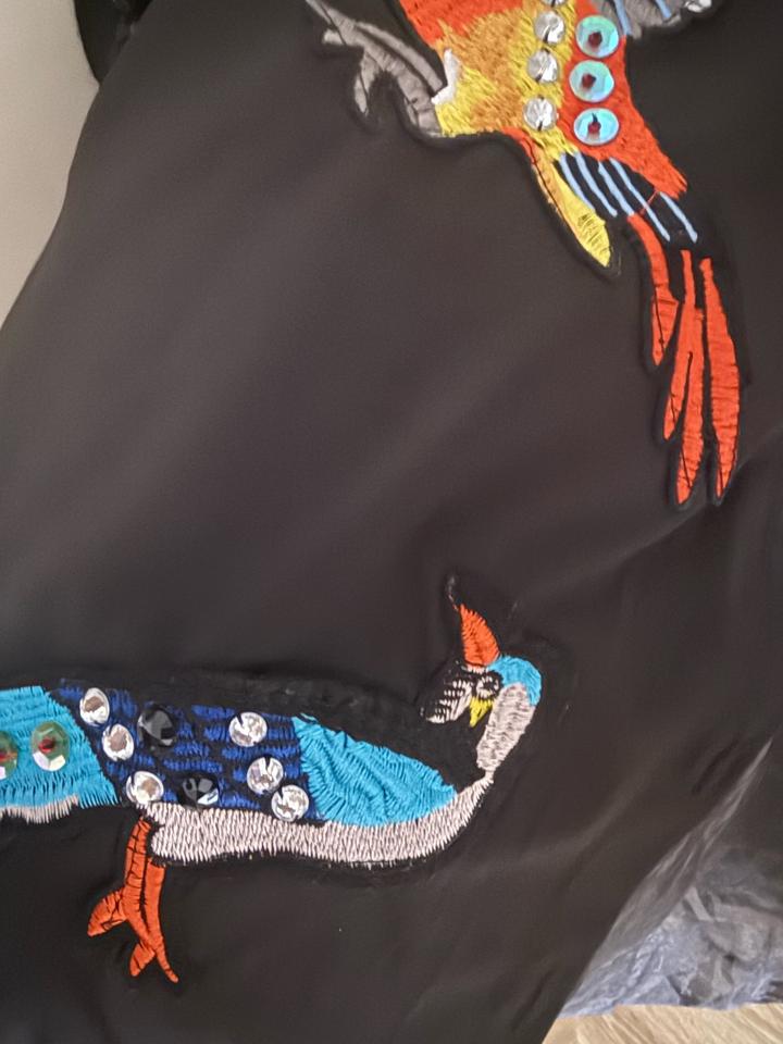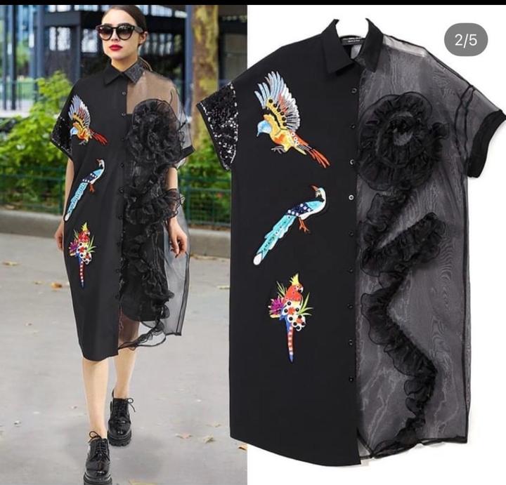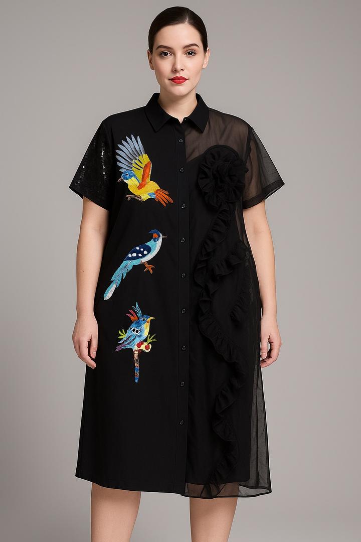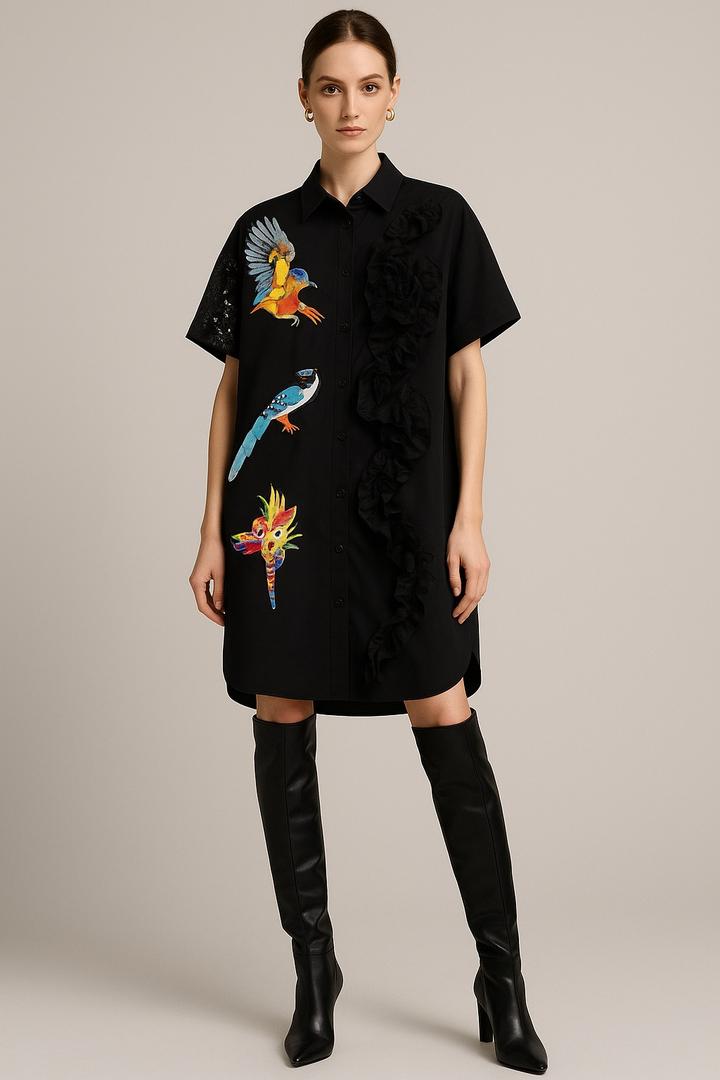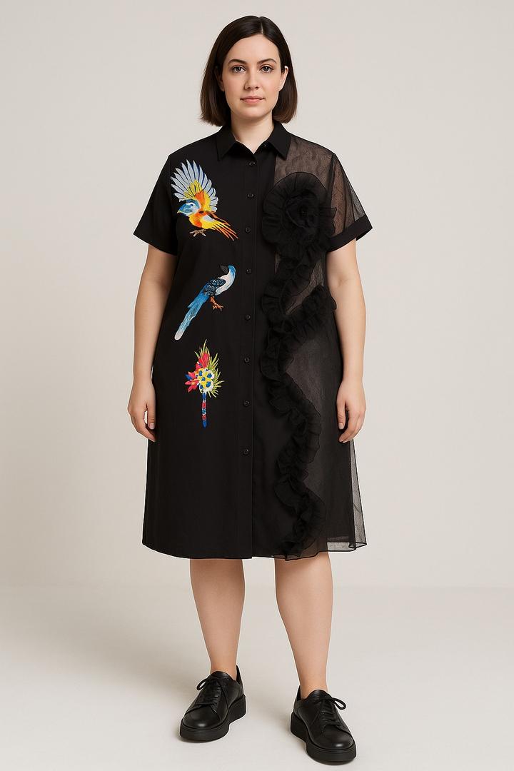 Дизайнерское платье-рубашка Stella Marina Collezione (Италия) с акцентной вышивкой птиц. Сочетание плотной ткани и лёгкого шифона создаёт эффект настоящей couture-модели. Свободный универсальный крой подходит на размеры 42–48, превосходно скрывает живот, бока и объёмы, визуально стройнит и вытягивает силуэт. Стильно смотрится с ботфортами и кедами. Артикул: 355741