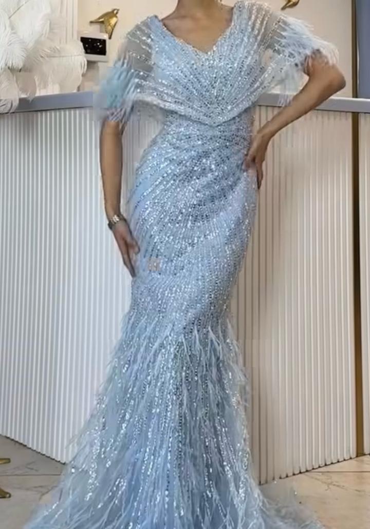 Нежное вечернее платье в нежно-голубом оттенке с роскошной вышивкой и мерцающими пайетками. Модель выполнена из легкой ткани, украшенной длинными струящимися перьями, которые создают эффект движения. Верх с V-образным вырезом и прозрачными плечами делает образ элегантным и утончённым. Платье красиво подчёркивает талию и плавно спускается к полу, создавая изысканный, праздничный силуэт Артикул: 357414