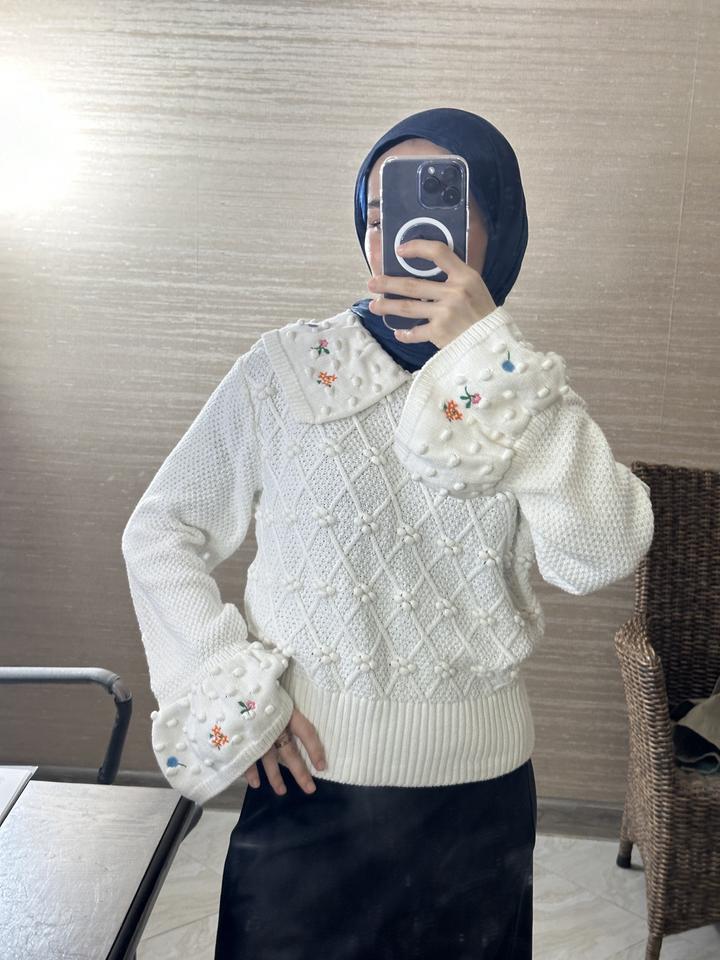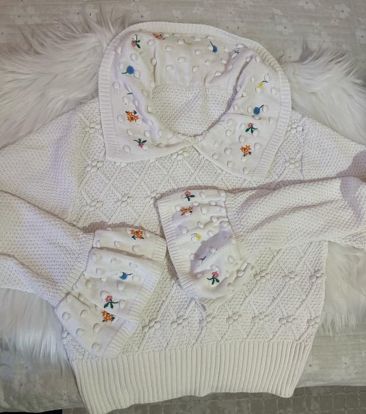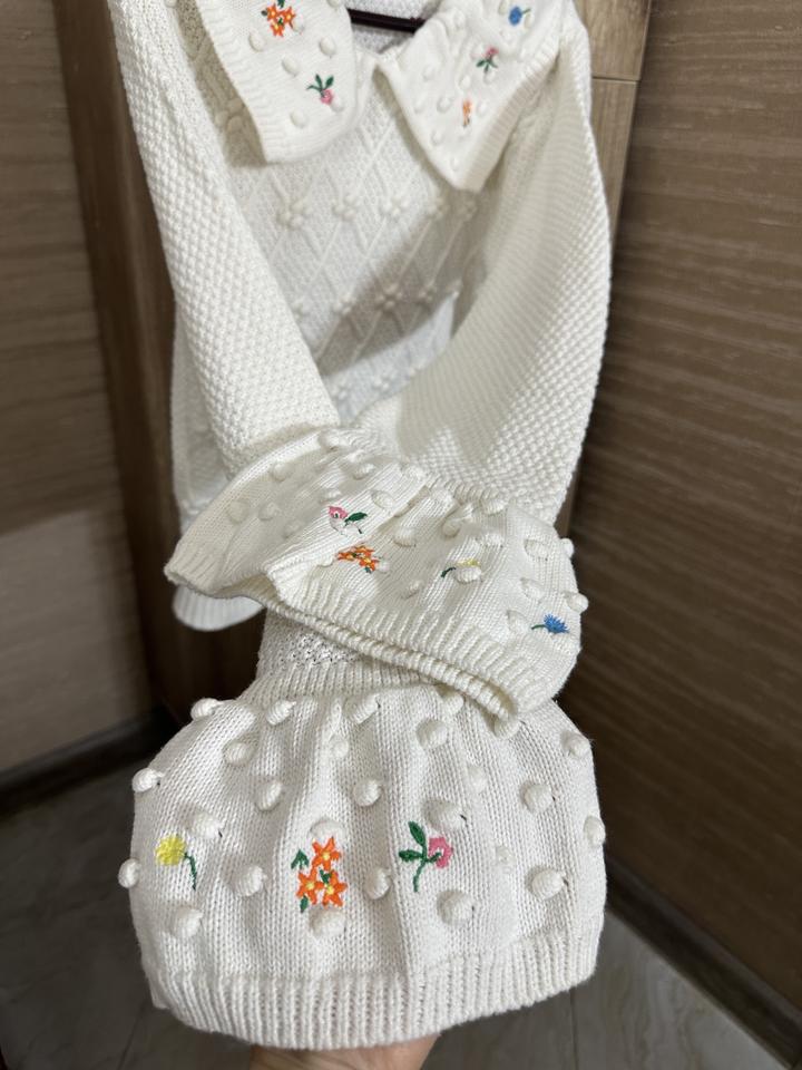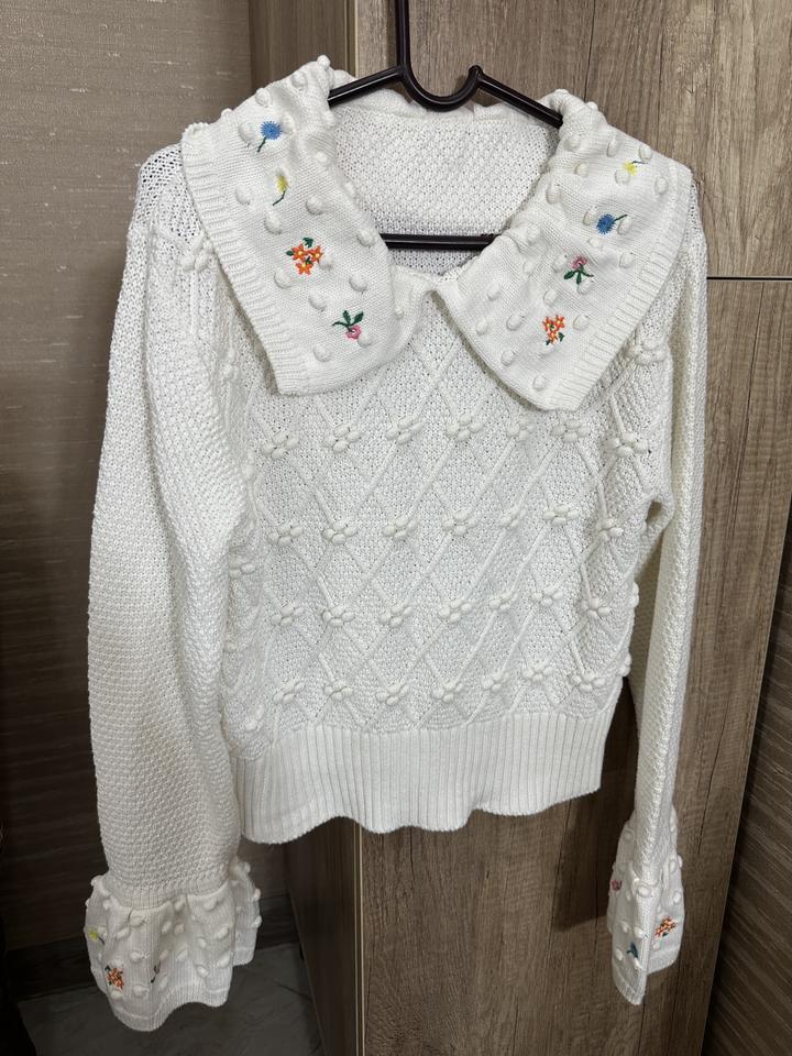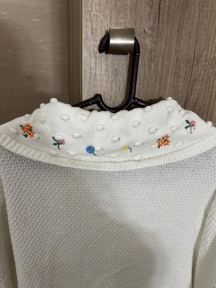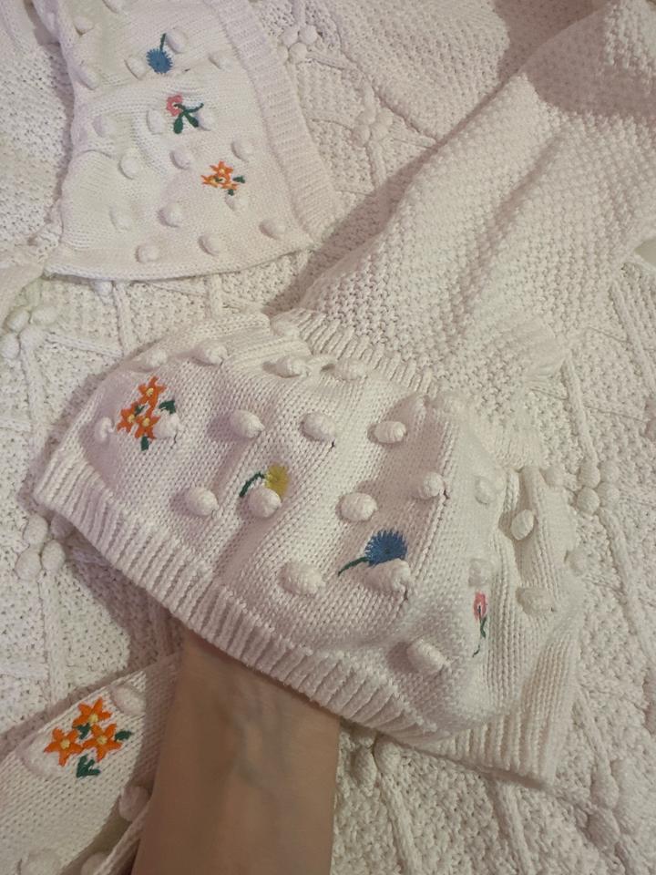 Вязаная кофта с объёмной текстурой и аккуратной вышивкой цветочков Широкие манжеты и воротник украшены милыми выпуклыми “бубочками” Купила в винтейж магазине Размер: S M Артикул: 358252