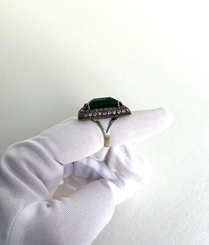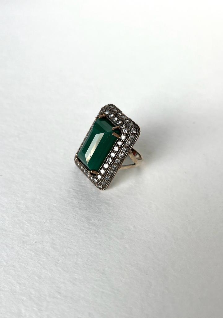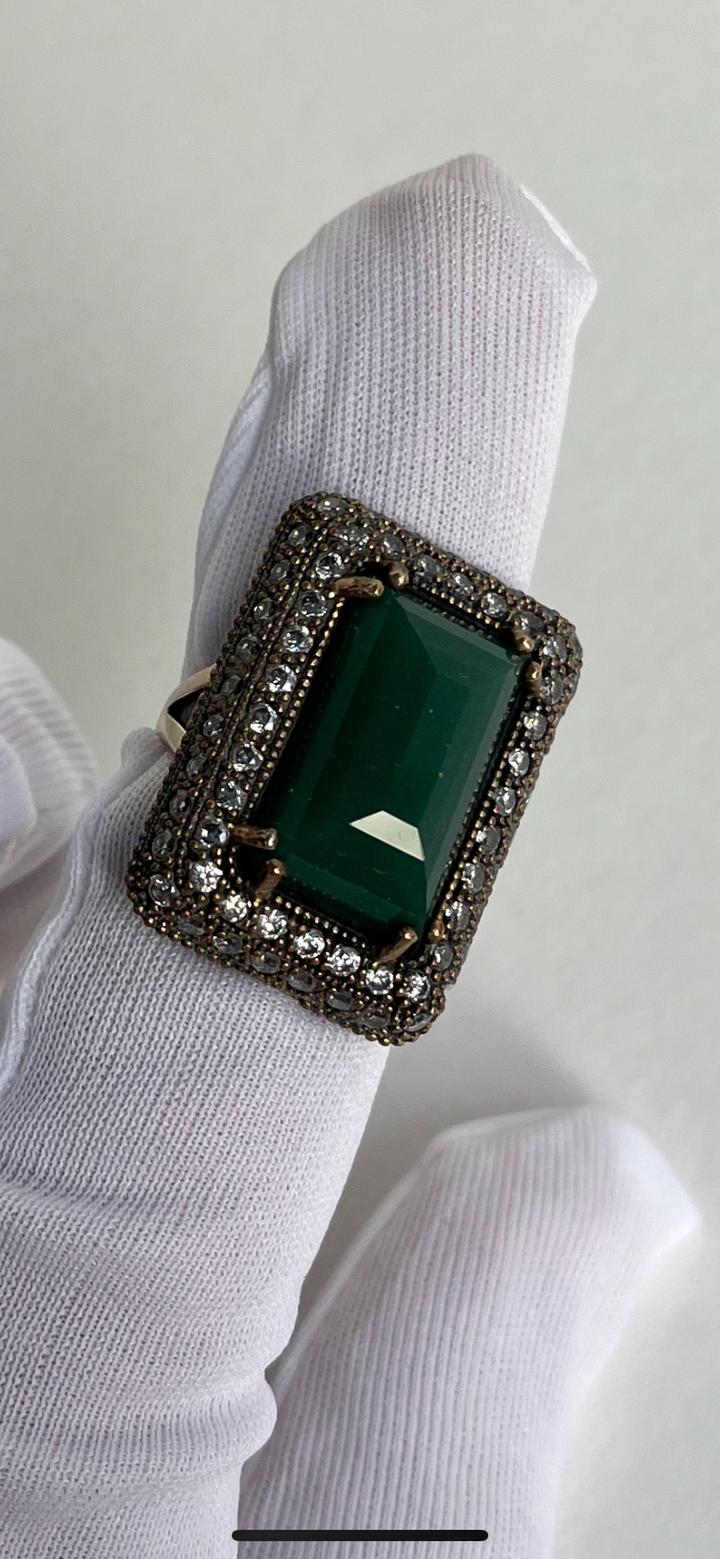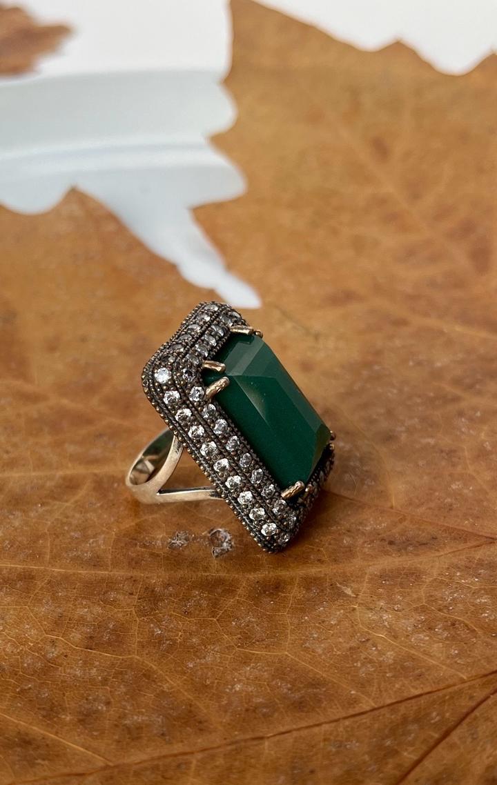 Размер 18-18,5. Элегантное винтажное кольцо в восточном стиле из серебра 925 пробы с крупным прямоугольным зелёным ониксом и двойной декоративной окантовкой из сияющих фианитов. Украшение выполнено в ярко выраженном стиле ретро-гламур — сочетает массивную форму, контраст металлов и выразительный цвет центрального камня. Кольцо чистое, не носили. Артикул: 359671