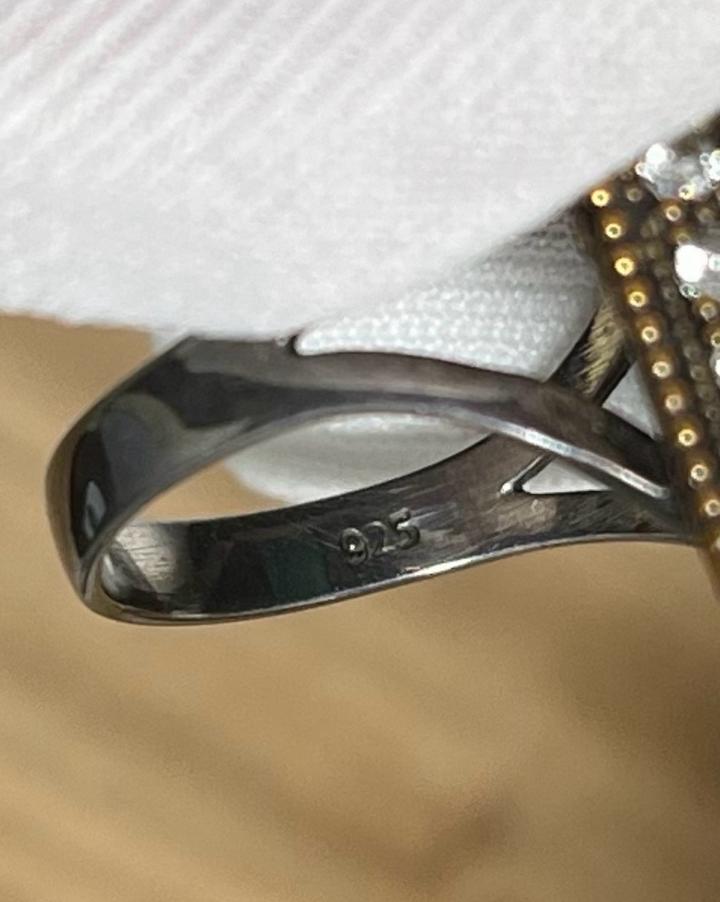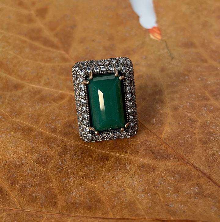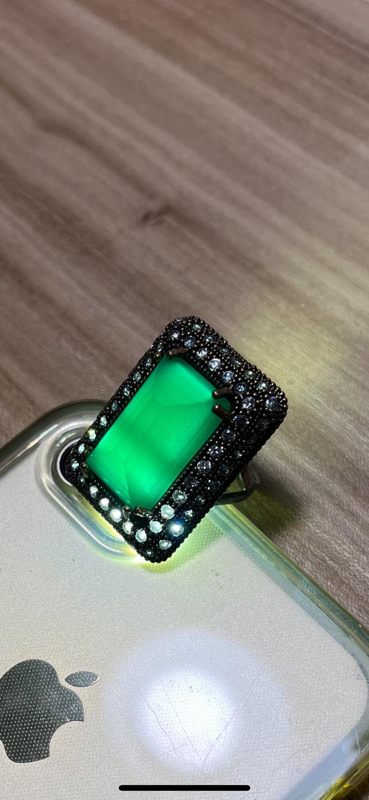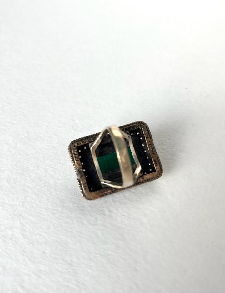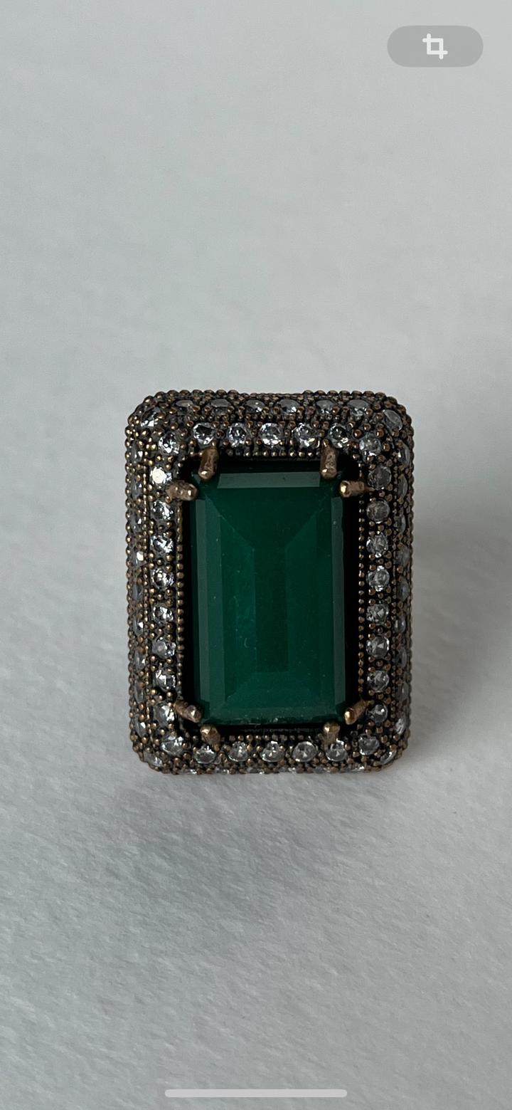 Размер 18-18,5. Элегантное винтажное кольцо в восточном стиле из серебра 925 пробы с крупным прямоугольным зелёным ониксом и двойной декоративной окантовкой из сияющих фианитов. Украшение выполнено в ярко выраженном стиле ретро-гламур — сочетает массивную форму, контраст металлов и выразительный цвет центрального камня. Кольцо чистое, не носили. Артикул: 359671