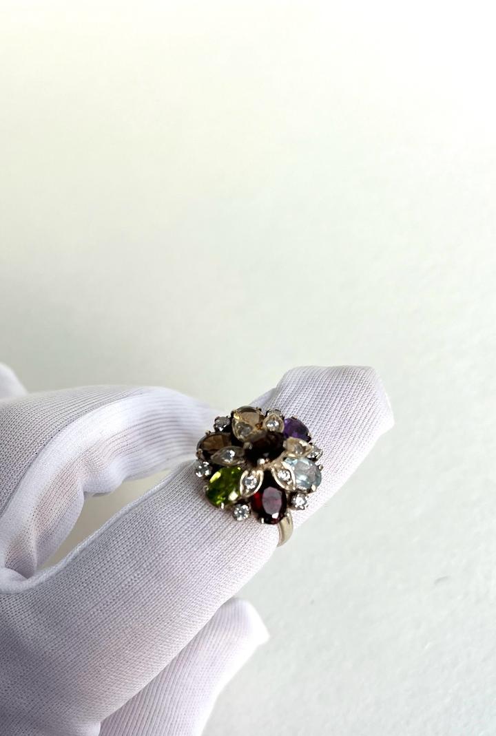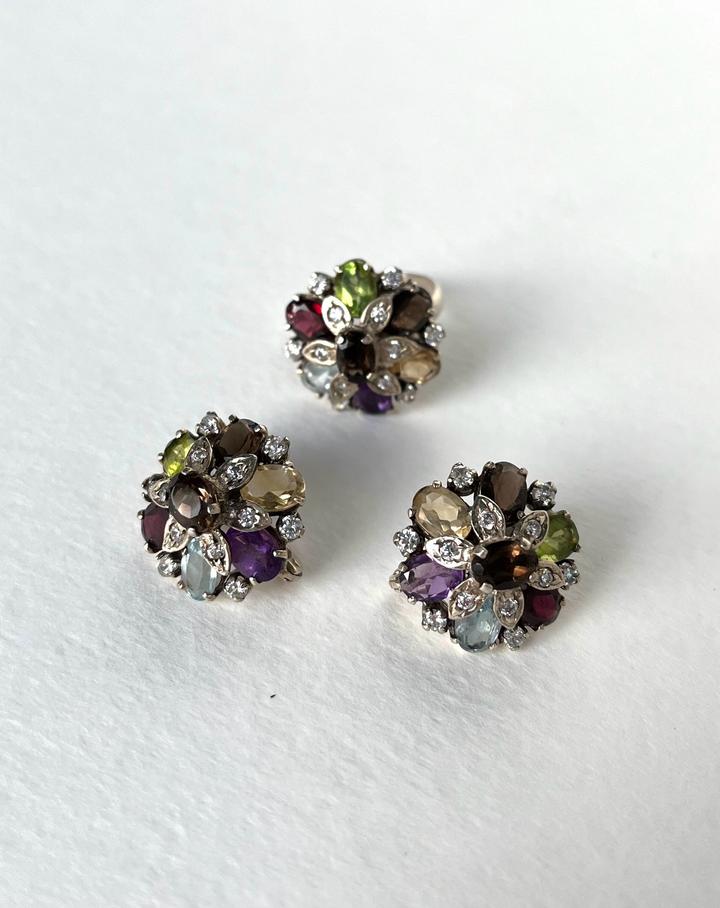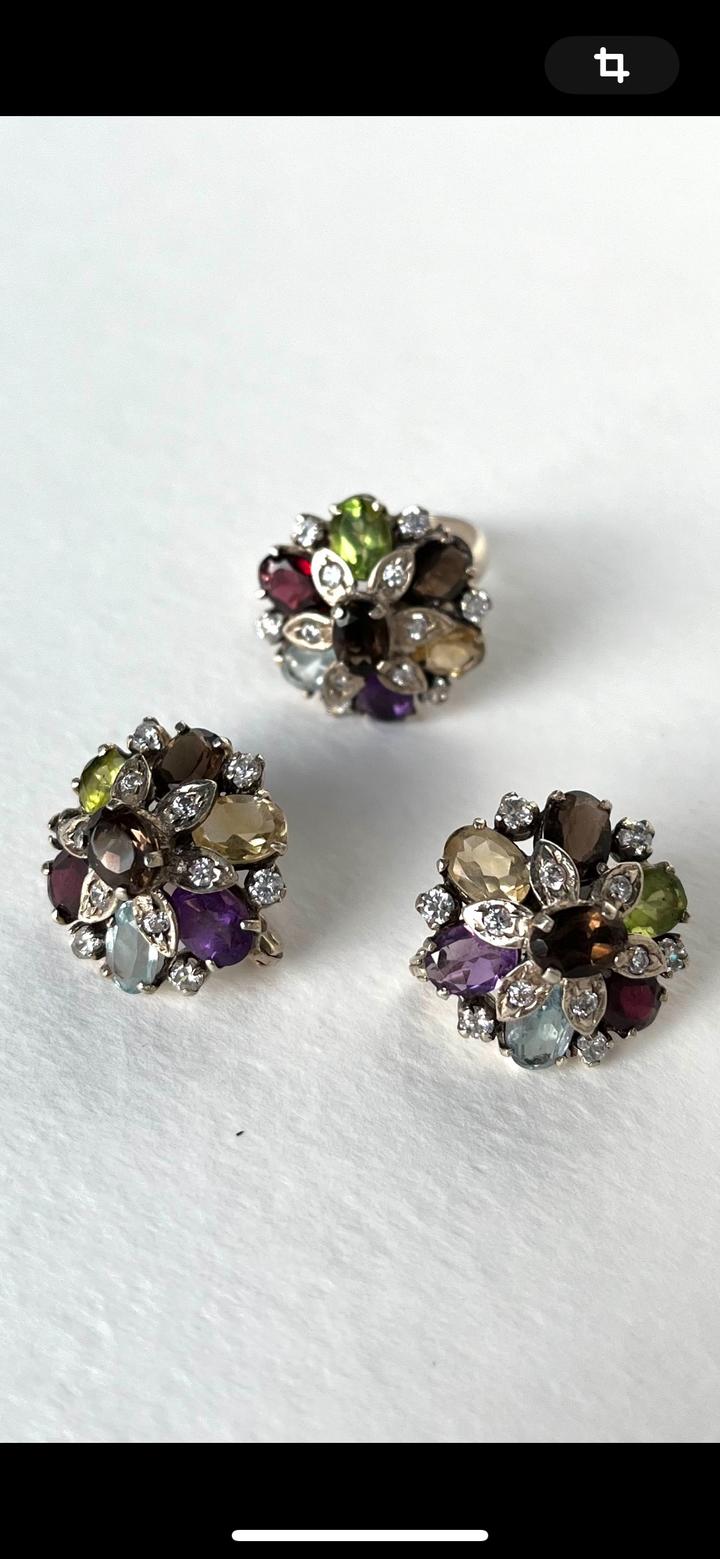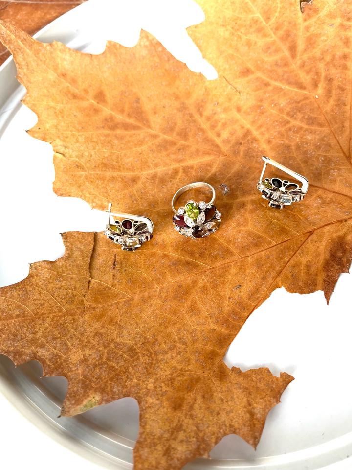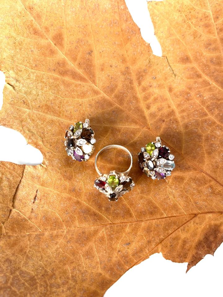 Изящные серьги и кольцо выполнены из серебра 925 пробы,в виде цветочной композиции из натуральных вставок: перидот, аметист, гранат, раухтопаз, цитрин и аквамарин. Камни огранены в форме «овал» и «маркиз», окружены сияющими фианитами, которые подчёркивают игру цвета. Новый, не носили.Подойдёт для торжественных случаев и для повседневной носки. Размер кольца-18. Набор в коробочке. Артикул: 359881