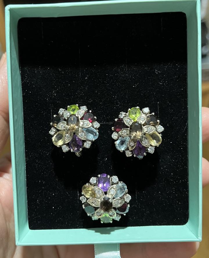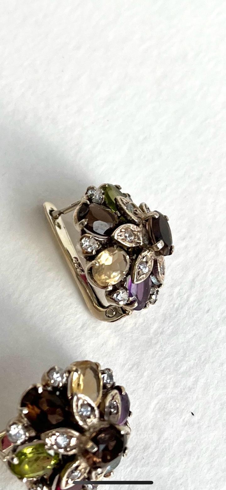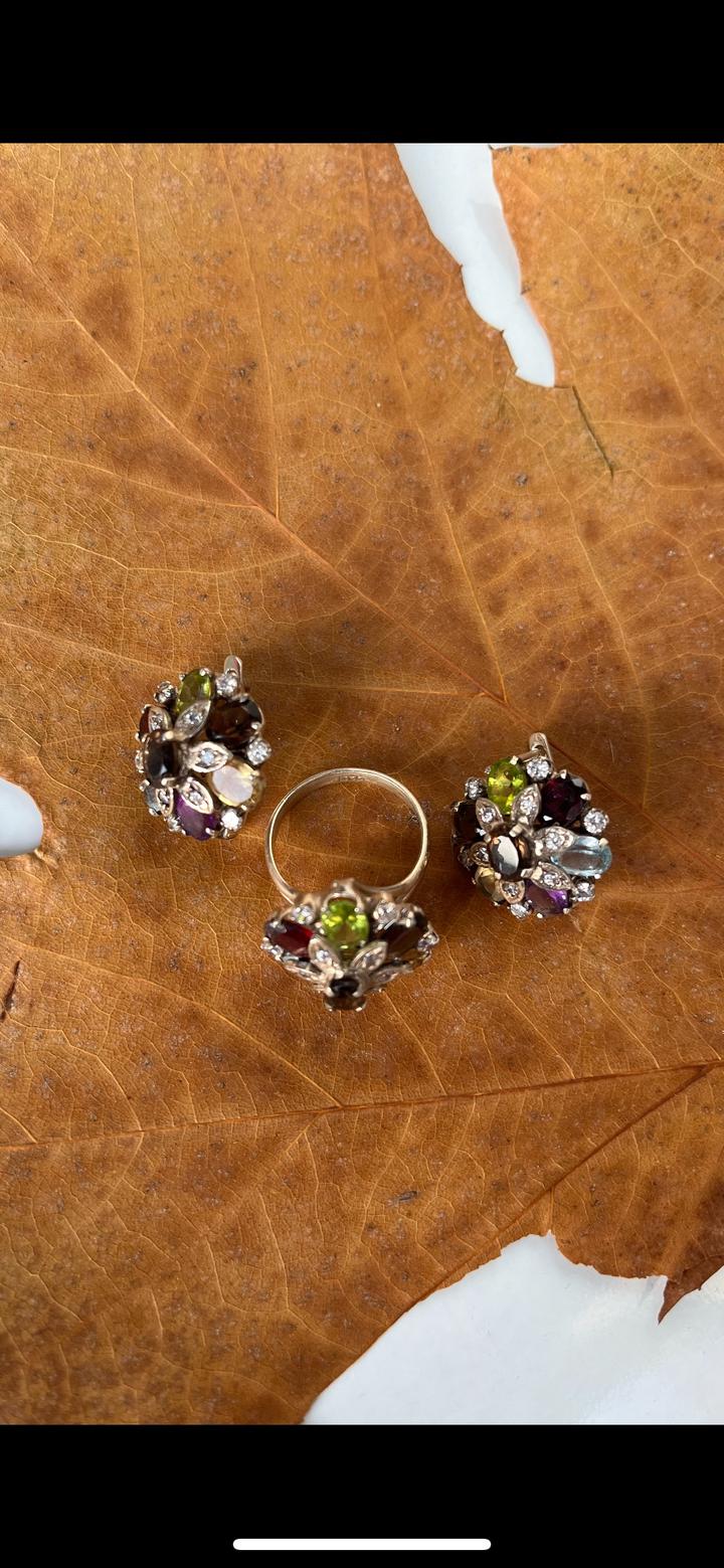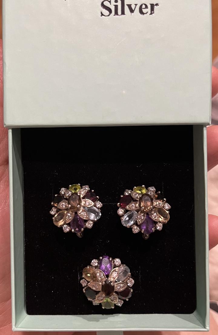 Изящные серьги и кольцо выполнены из серебра 925 пробы,в виде цветочной композиции из натуральных вставок: перидот, аметист, гранат, раухтопаз, цитрин и аквамарин. Камни огранены в форме «овал» и «маркиз», окружены сияющими фианитами, которые подчёркивают игру цвета. Новый, не носили.Подойдёт для торжественных случаев и для повседневной носки. Размер кольца-18. Набор в коробочке. Артикул: 359881
