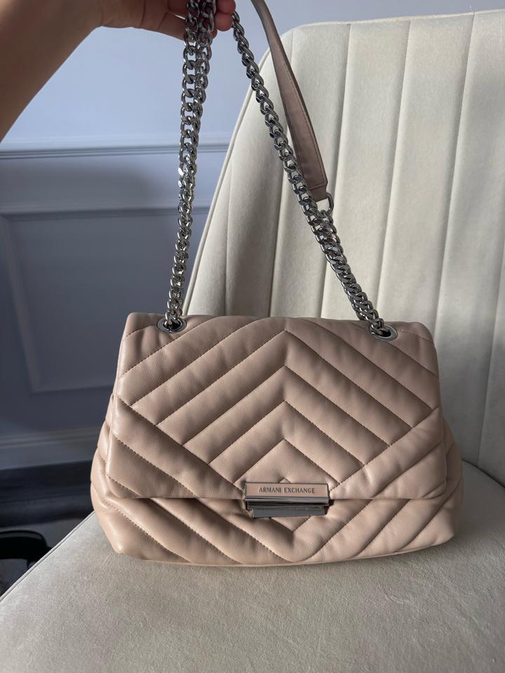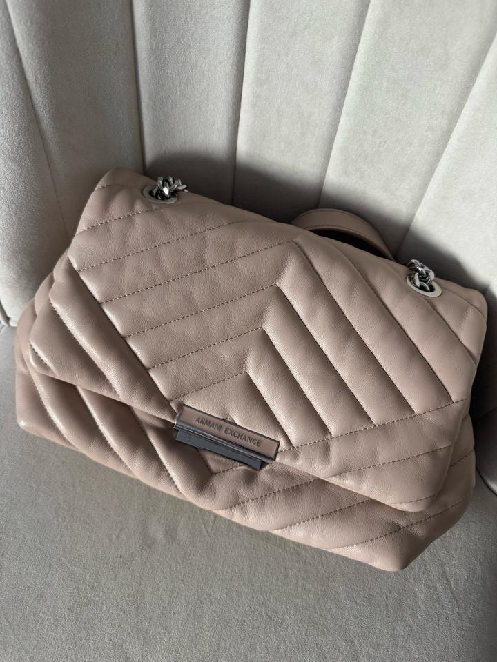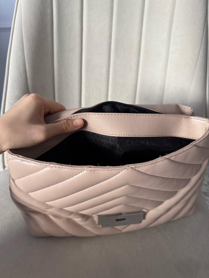 Брала этим летом в Европе, стеганая сумка armani Exchange с серебристой фурнитурой. Экокожа. Официальный сайт. Носилась только летом в Европе. Пыльно розового цвета. Размер примерно как iPad. 10 дюймов ширина. 24 см примерно. Есть пыльник Армани и пакет Артикул: 359922