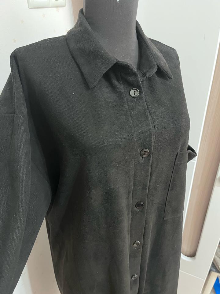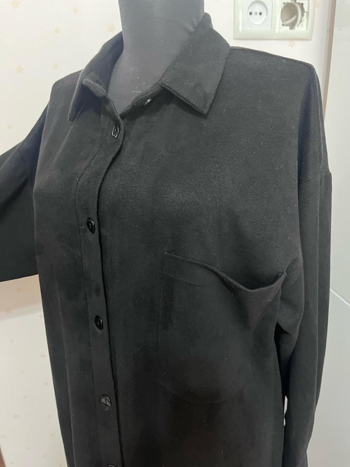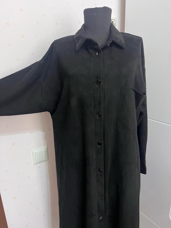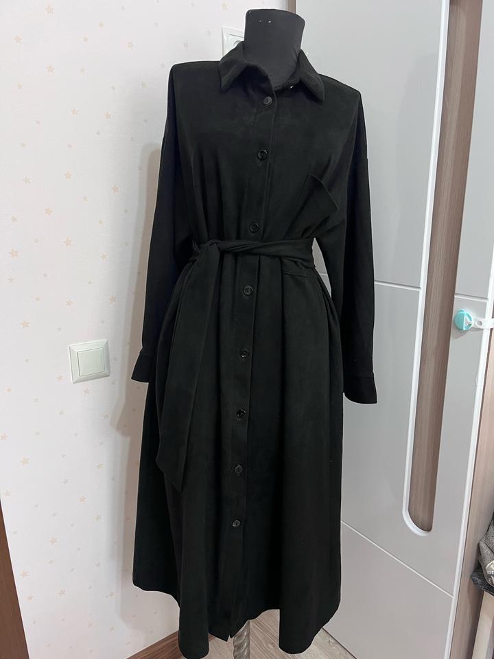 Черное платье-рубашка с поясом Ткань спандекс, похожа на замшу Длина ниже колена при росте 170см, платье оверсайз подойдет до 48размера Артикул: 363179