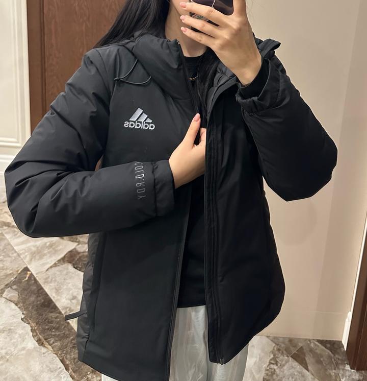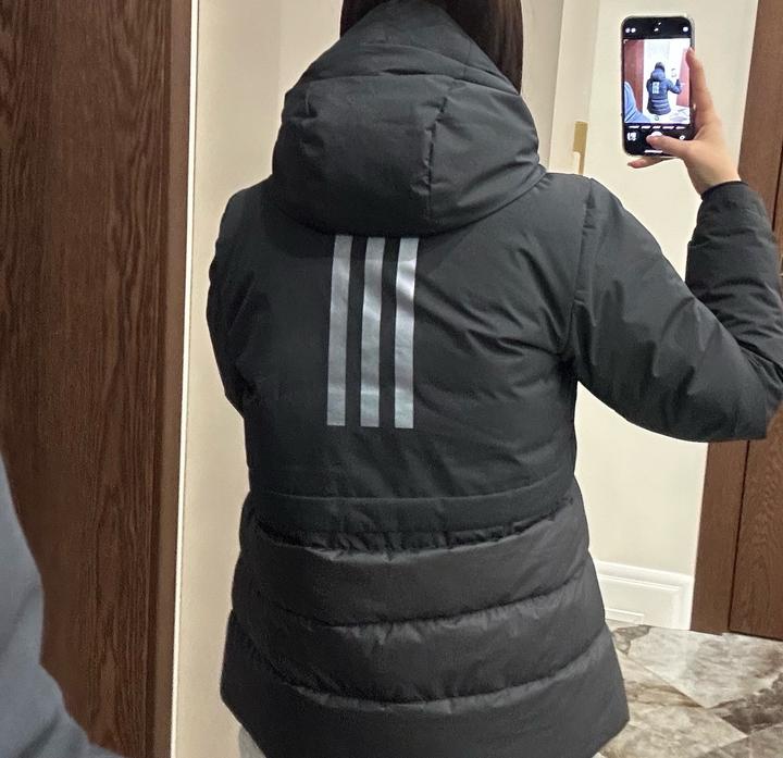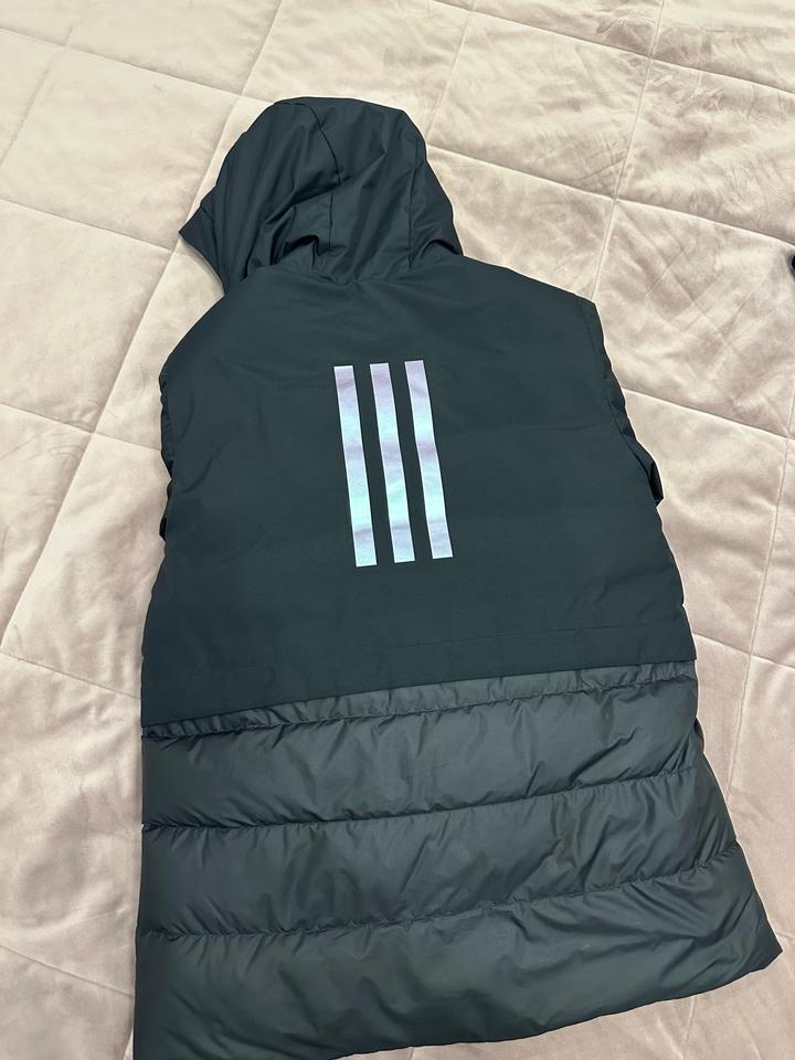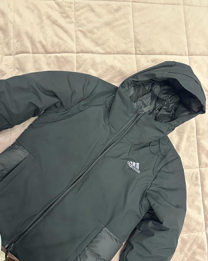 Зимняя куртка адидас. Покупалась непосредственно в официальном магазине Адидас. Теплая, уютная. Небольшой дефект у воротника, белая штучка не отстиралась у меня, но может у вас получится. Возможно от косметики. Артикул: 363629