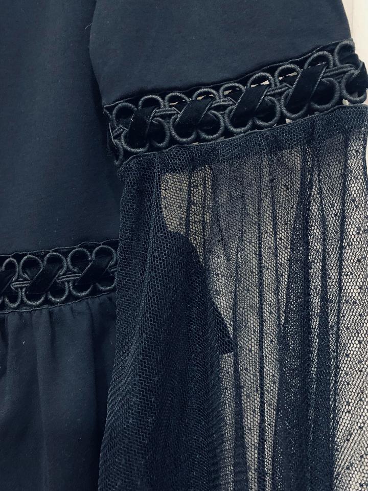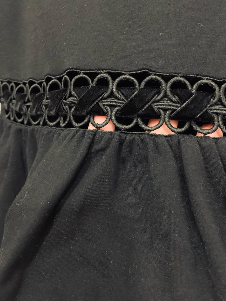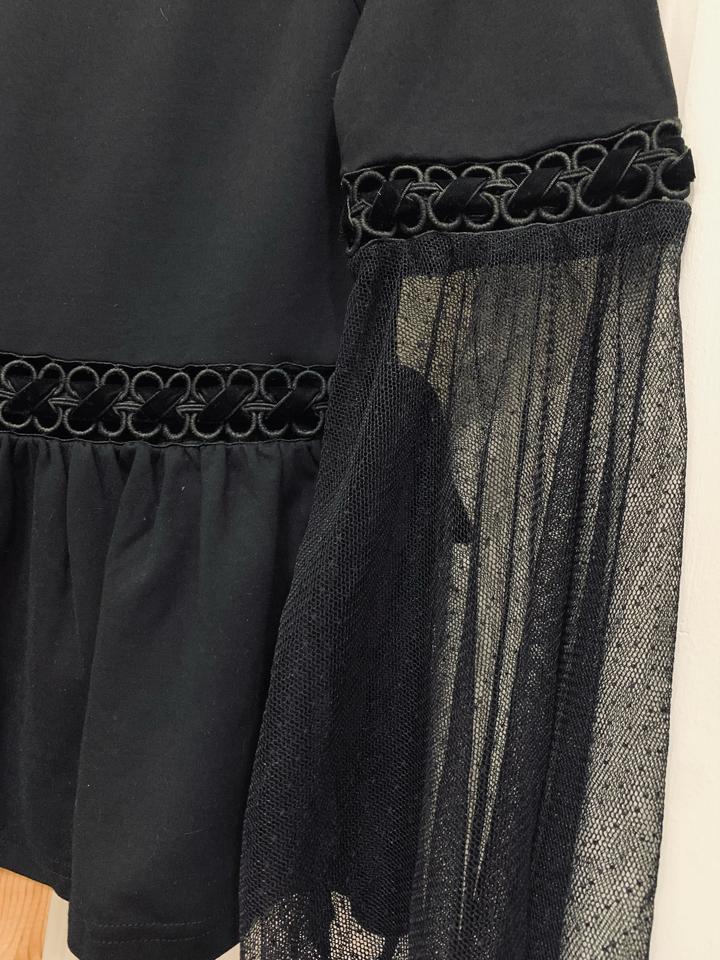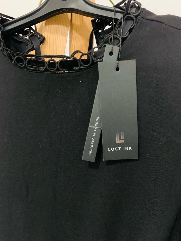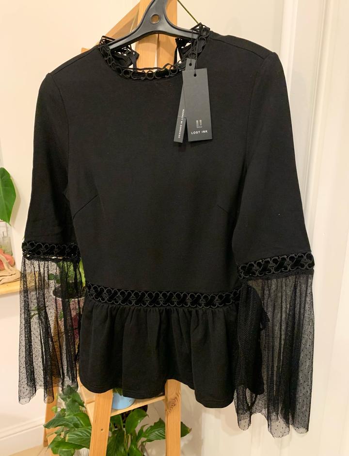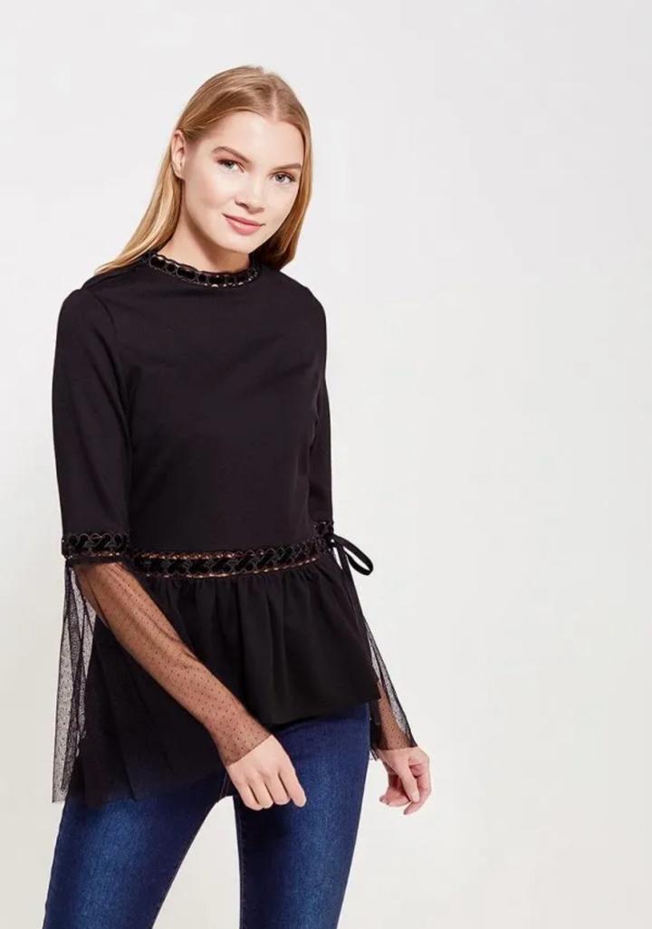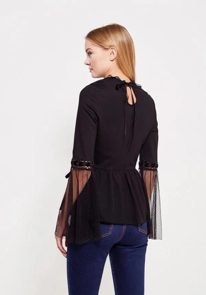 Черная эффектная блуза от известного бренда Lost Ink, 150 хороших отзывов именно на нее на Lamoda. Расклешенные гипюровые рукава и бархатные ленты добавят образу темной романтики. Размер XS, но тянется, можно и до М. Артикул: 364366