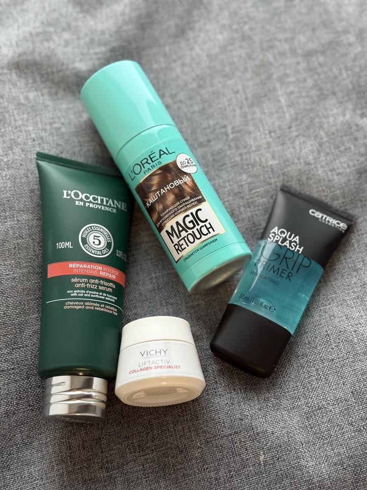 L'OREAL PARIS magic retouch - (Использовался 1 раз, не подошел по цвету) L’occitane Aromachologie Intensive Repair Anti Frizz Serum - (Использовался 2 раза, в декрете вообще не делаю укладки) VICHY Liftactiv Collagen Specialist - новый Primer от Catrice - (Попробовала 1 раз, мне не подошел) Все, что на 2 фото идет в подарок 🎁 46TKQY промокод на -2000 Артикул: 366309