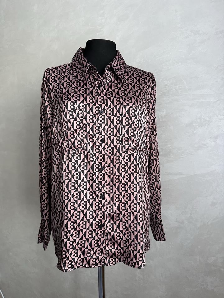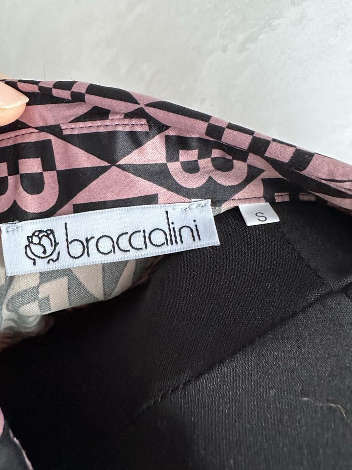 Блузка Braccialini с фирменным геометрическим принтом в чёрно-пудровой гамме. Прямой, свободный крой, классический отложной воротник, застёжка на пуговицы. Хорошо смотрится как навыпуск, так и заправленной. Ткань лёгкая, гладкая, комфортная в носке, красиво драпируется. Размер S. Отличный акцентный вариант для офиса, города и стильных повседневных образов. Блузка в идеальном состоянии, надевала один раз. Итальянский бренд. Покупала в Питере в прошлом году. Артикул: 368703
