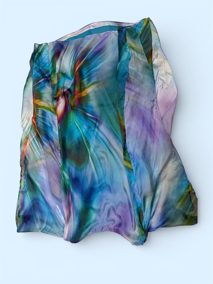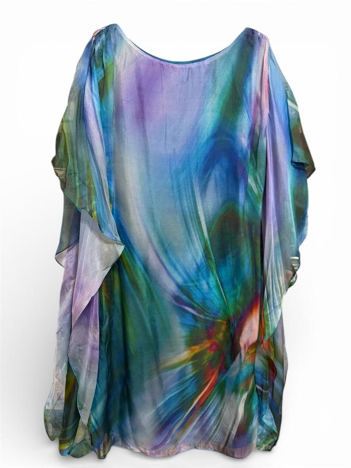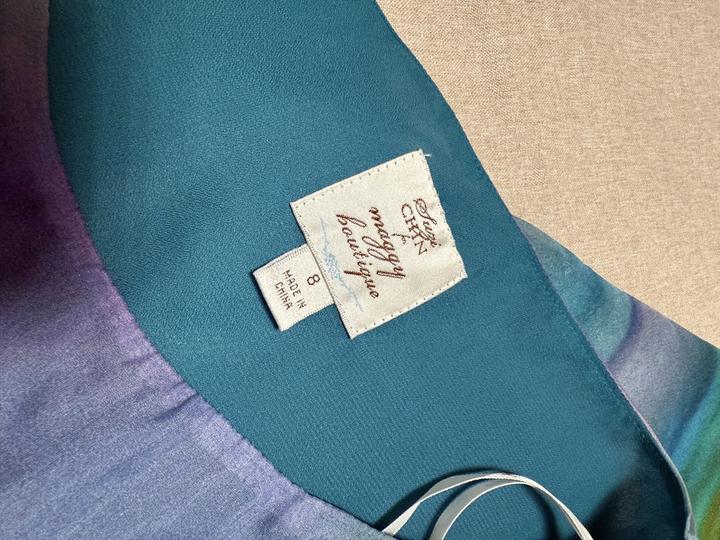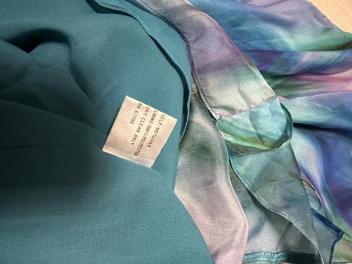 Шелковое платье Susi Chin for Maggy Boutique. Материал: 100% шёлк, тонкий, воздушный, полупрозрачный верх + подклад Длина: миди больше всего Покрой: коктейльный / вечерний, прямой Принт: акварельный Цветовая гамма: сине-бирюзово-фиолетовая Есть ремень, но его можно не надевать либо надеть другой. Ремень нужно распрямлять Артикул: 369130