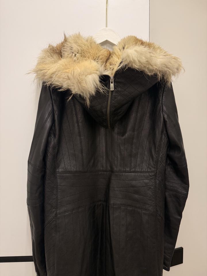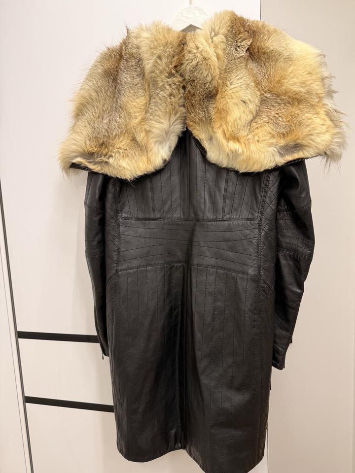 Натуральная кожа, натуральный мех волка. Длина до колена. Полностью стееганная кожа. Без потертостей. Размер 42-46. Покупала за 98000тг. Артикул: 370353