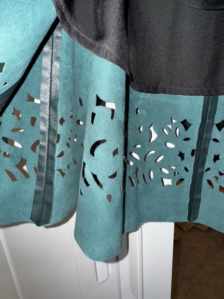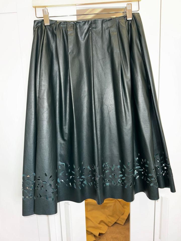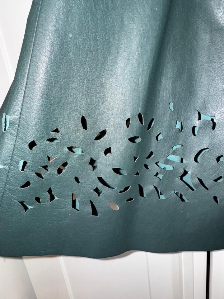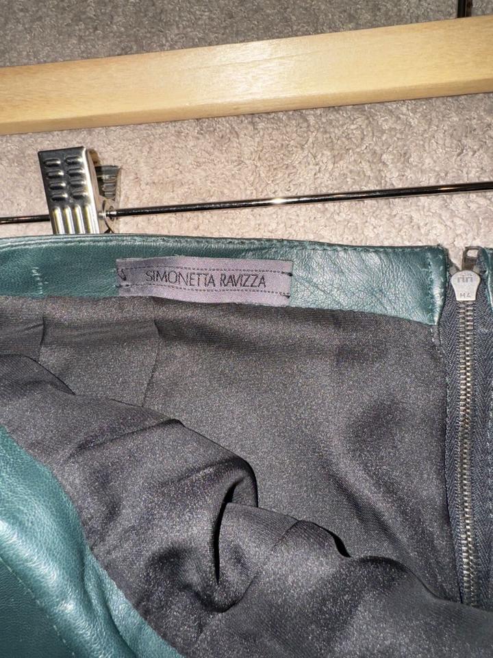 Кожаная юбка Simonetta Ravizza, мягчайшая кожа красивого бутылочно-изумрудного цвета, с подкладом, в отличном состоянии. Два боковых кармана, лазерная перфорация по всему подолу, подклад. Длина 63 см, размер XS-S, 40 It Артикул: 372201