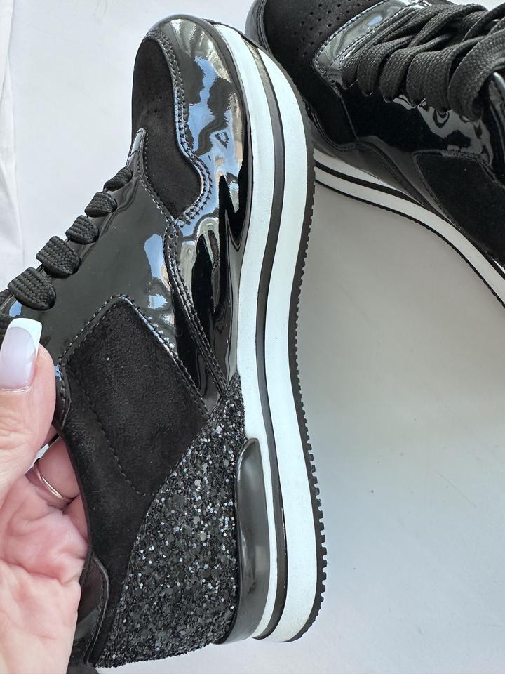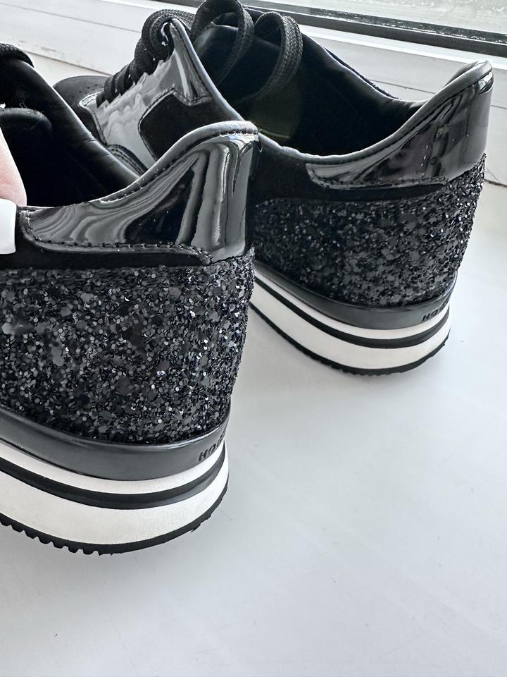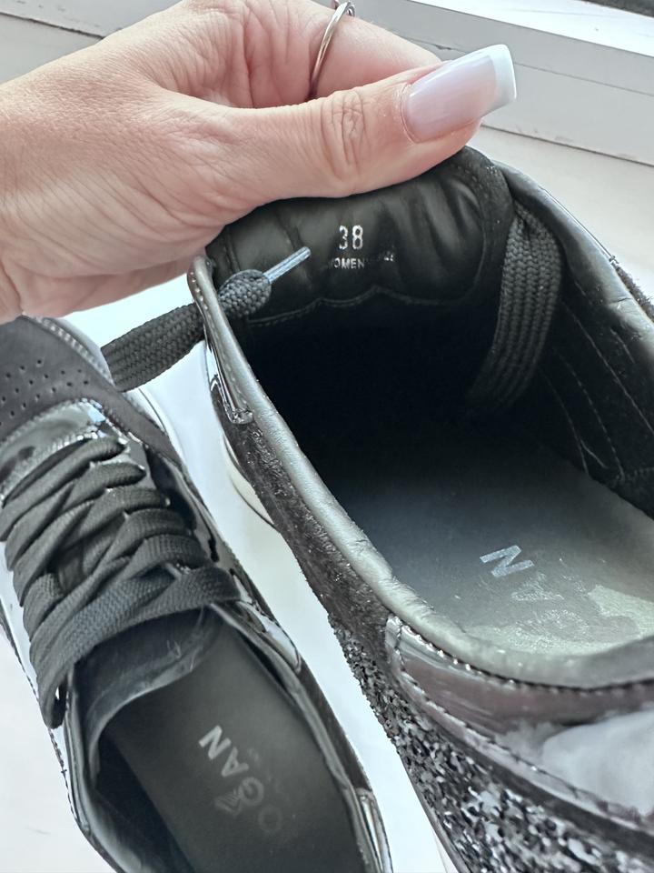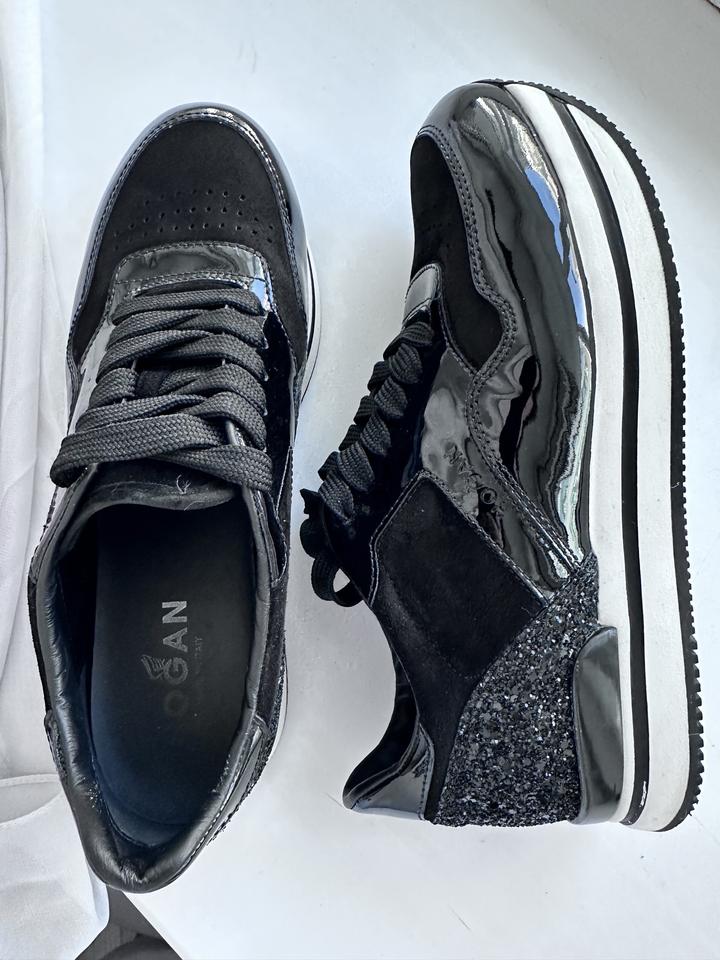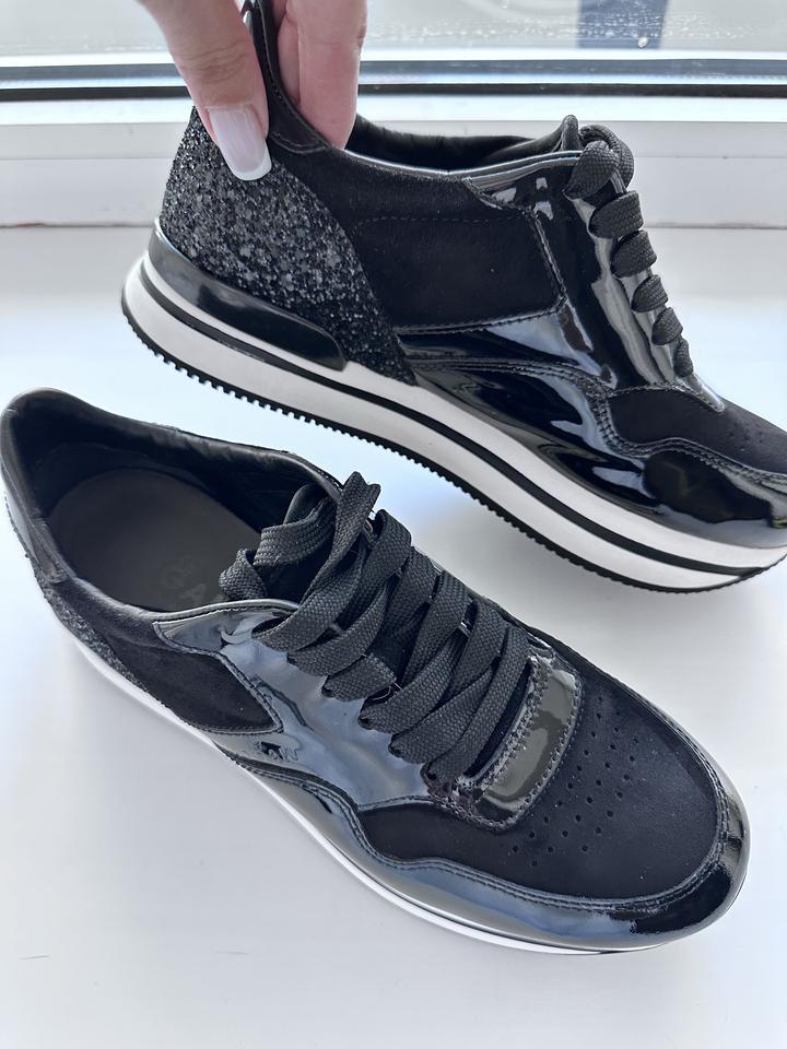 Кожаные кроссовки Hogan. 38 размер, натуральная кожа, замша, стразы. Небольшая платформа. Красиво сочетаются с платьями и спорт костюмами. В носке были раза три. Артикул: 373232