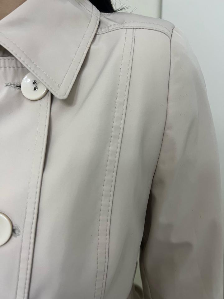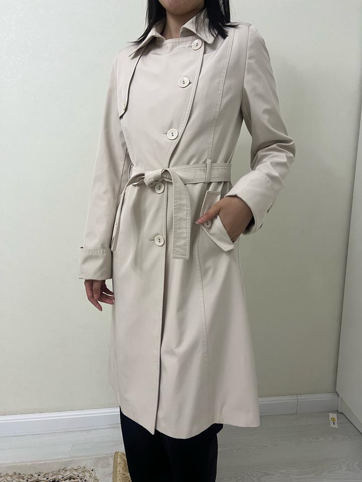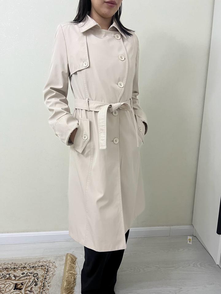 Плащ женский с поясом, боковыми карманами. Цвет светлый. Ткань отличная. Непромокаемый. Качество, пошив очень хорошее. Размер 44- 46. Длина ниже колен. Артикул: 375346
