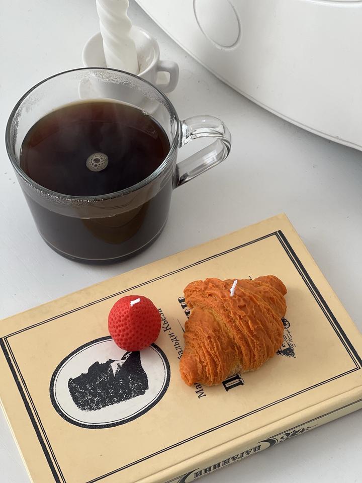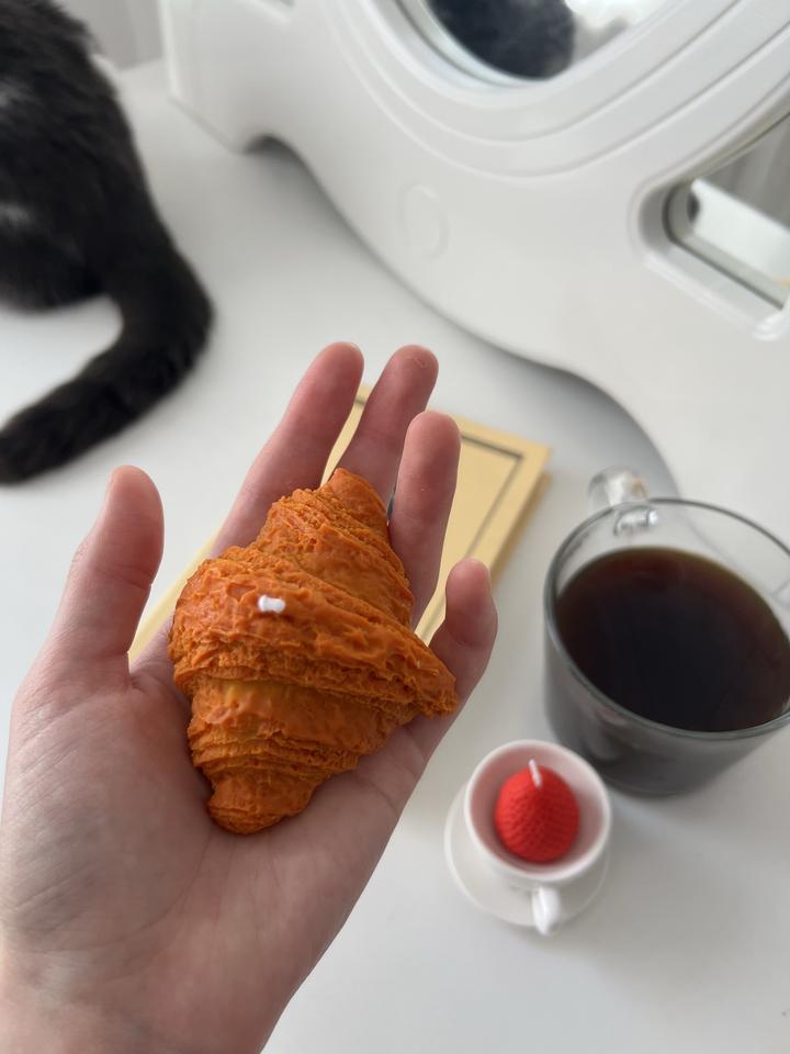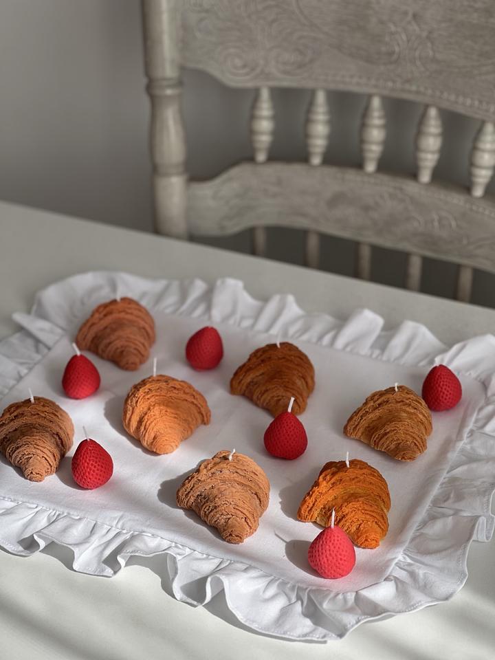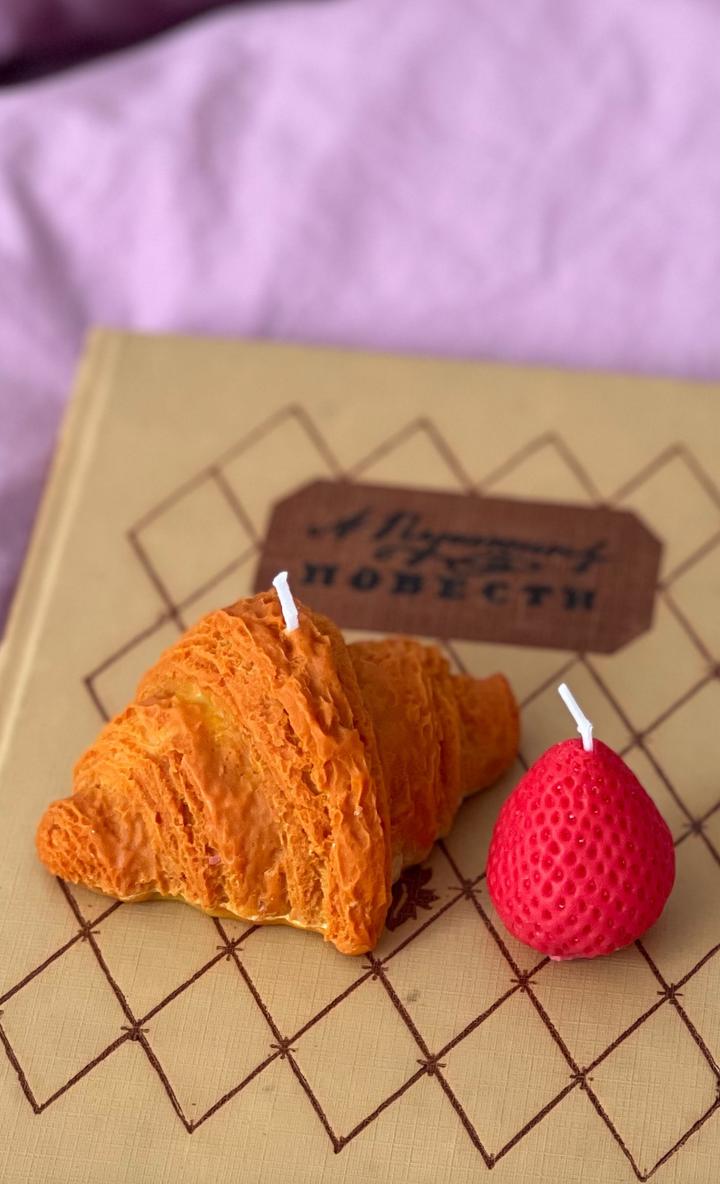 Свечи в форме круассана и клубники. Аромат миндального круассана и свежей клубники. В комплекте 2 свечи: 1 круассан и 1 клубника. Упакованы в коробочку с наполнителем. Максимально реалистичные Артикул: 375745