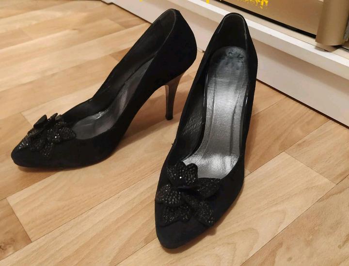 Туфли выполнены из качественной натуральной замши черного цвета. Закрытый мыс декорирован бантом со стразами. Изящный каблучок подчеркнет стройность Ваших ног. Кожаная стелька обеспечит комфорт. Идут на среднюю- узкую ногу. Носила несколько раз в помещении на мероприятиях. Нужно только набойки подбить. Продаю по символической цене так как не могу ходить на каблуках, лежат без дела Артикул: 376618