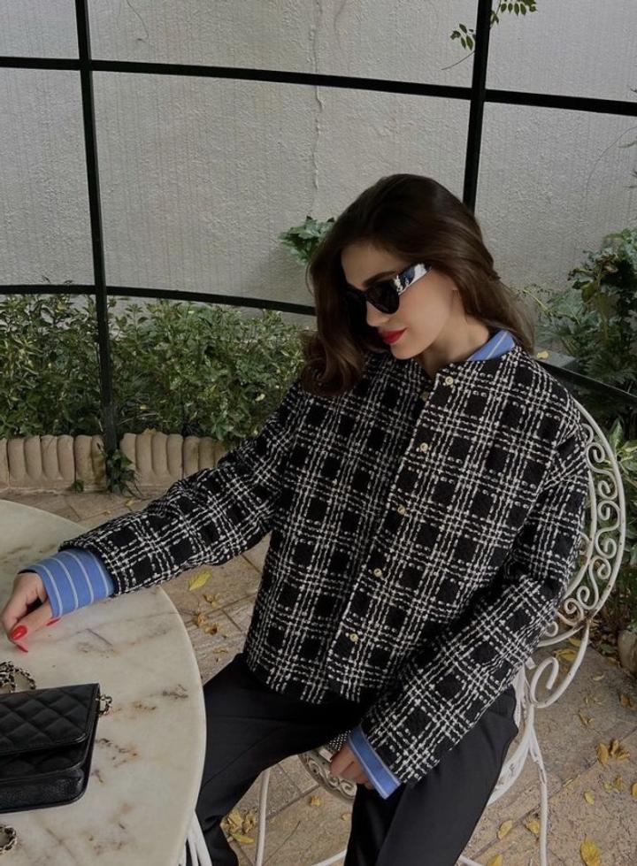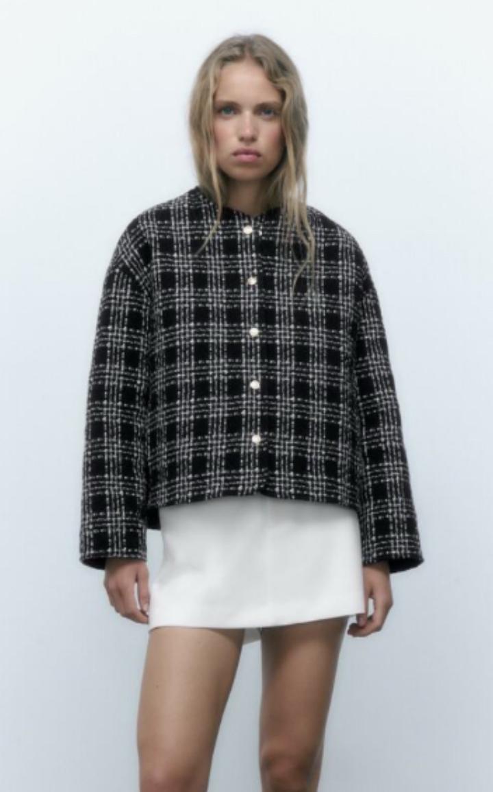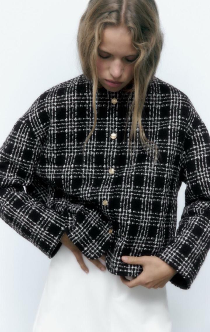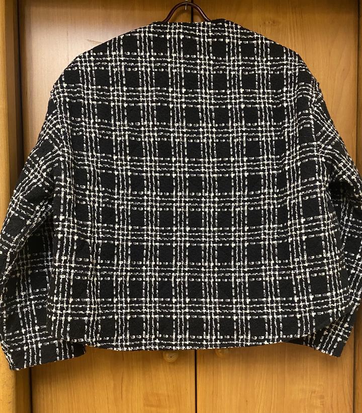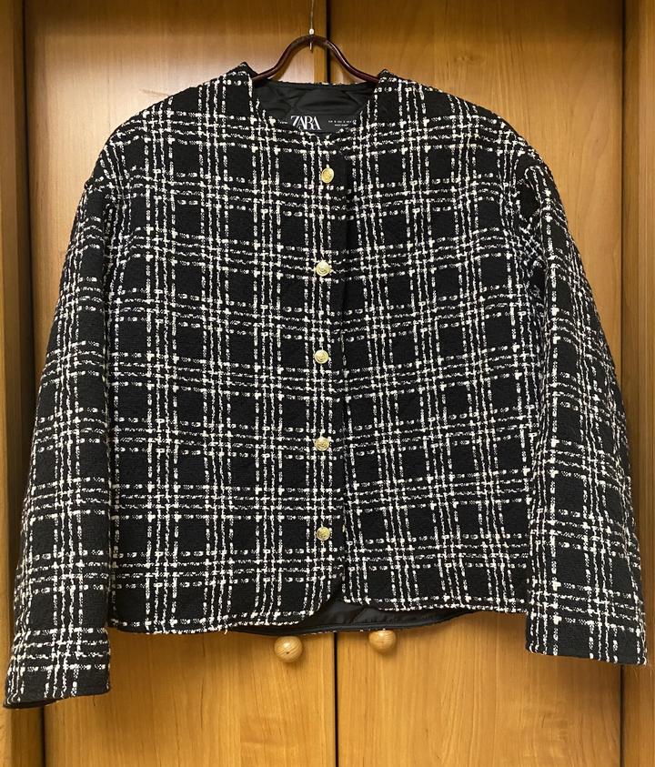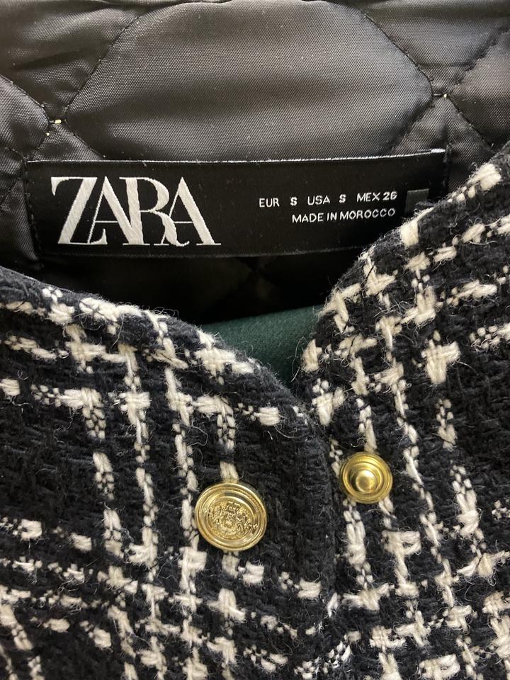 Жакет Zara, простеженный, утепленный, у него есть небольшое утепление, как у легкой весенней куртки. Также в составе есть шерсть. Жакет черного цвета с белыми полосками, которые образуют узор "клетка". Размер жакета - S (42-44), но так как он свободного кроя, то и на 44-46 вполне подойдет. Страна производства - Марокко. Жакет на кнопках золотого цвета. В идеальном состоянии, был 2-3 раза в носке. Артикул: 377255