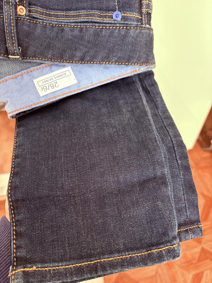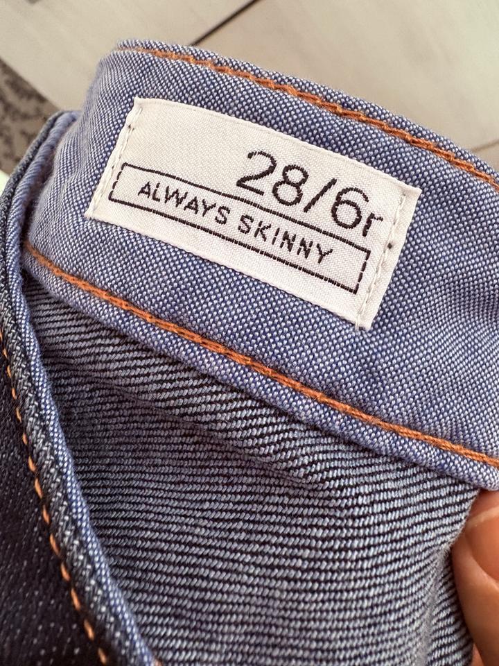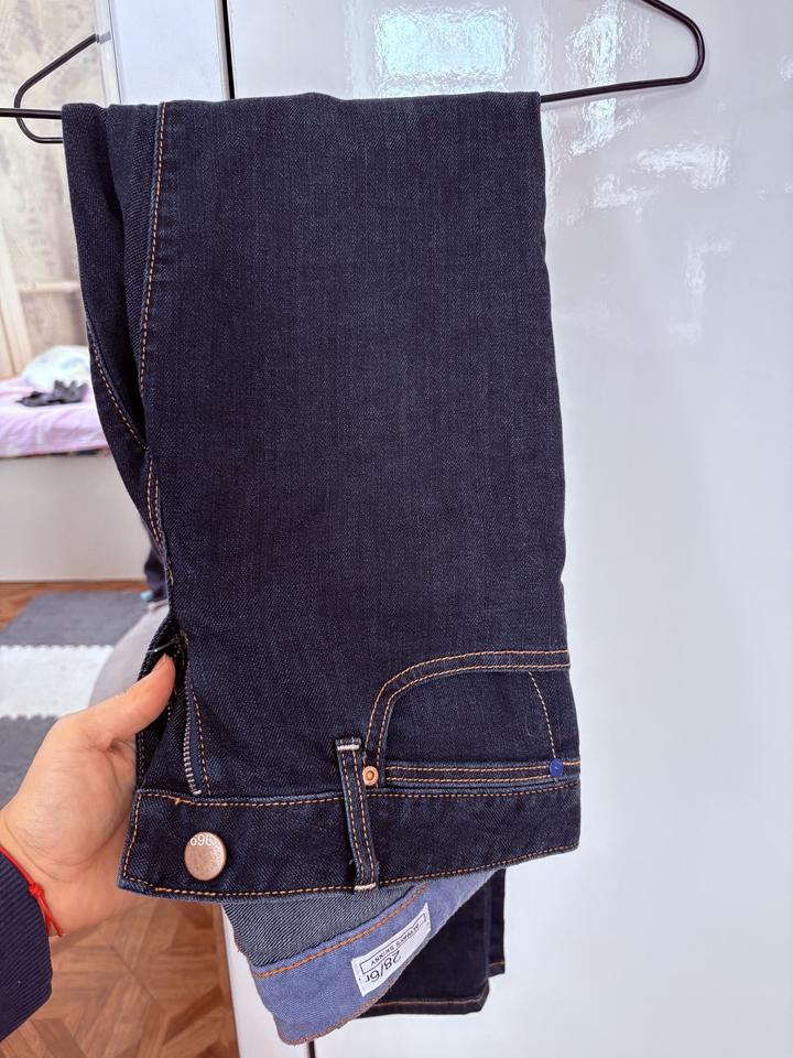 В темно синем оттенке, в идеальном состоянии. Скинни, на размер S-M, у меня S в талии немного большеват, но с ремнем нормально будет. Артикул: 377876