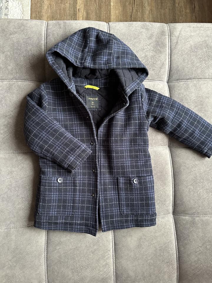 Бренд Mayoral.Демизезон. Легкое пальто на мальчика, 98 размер, на среднего и стройного мальчика, удлиненное, надевали пару раз на выход. На фото смотрится как будто есть катышки, на самом деле это ворсинки как у шерсти. Состав есть на фото, материал подклада хлопок. Артикул: 377981