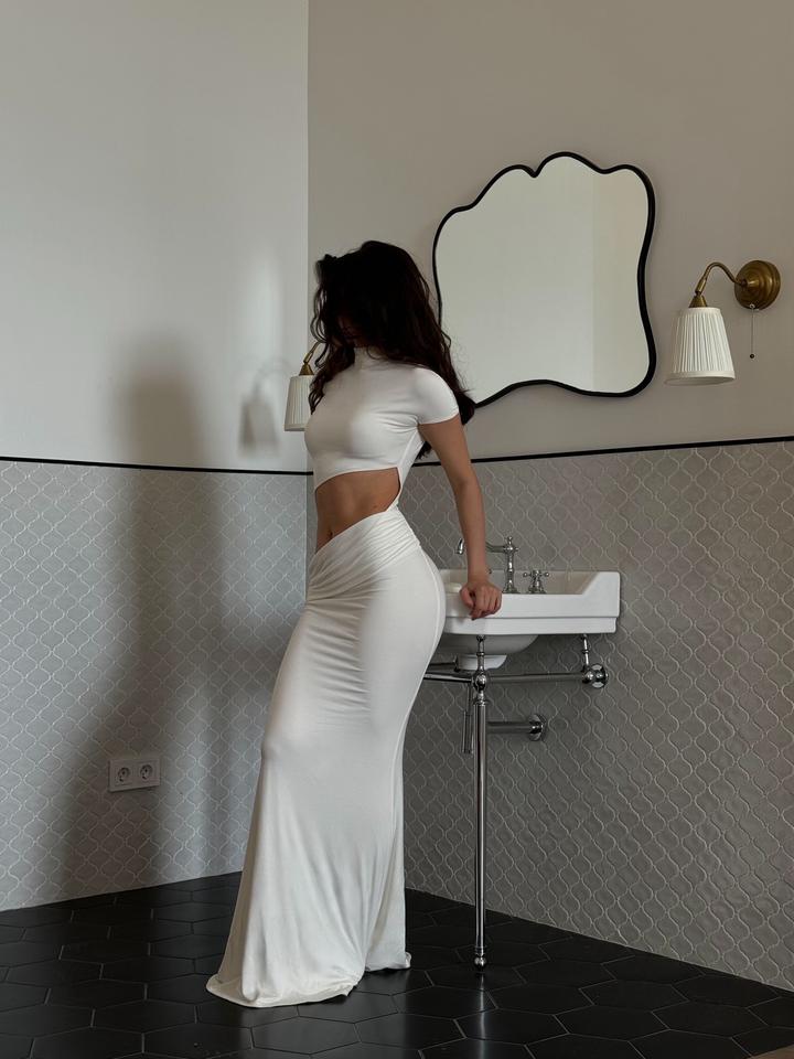 молочное платье Animavestra с вырезом на животе, длина в пол, материал плотный, имеет сборки по бокам есть небольшие пятна от косметики, их можно отстирать, у платья тугое горло, нужно чуть-чуть растягивать ворот, чтобы надеть (это дефект от самого бренда) Артикул: 378278