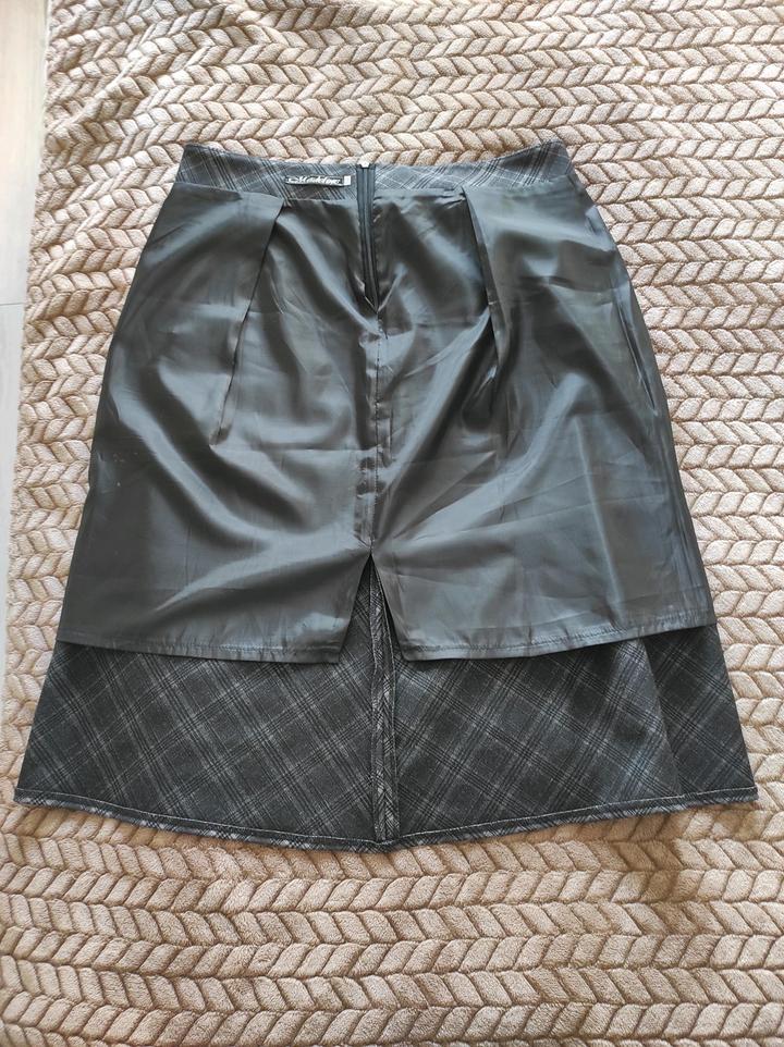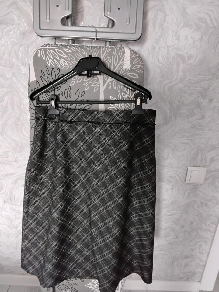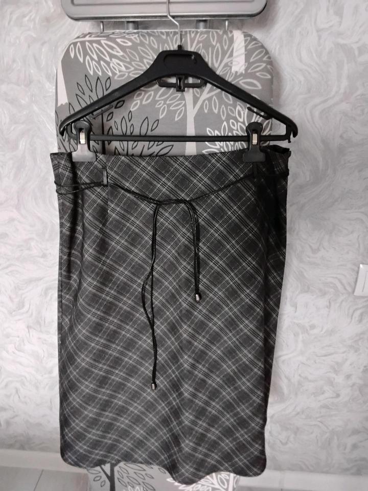 Серая юбка в клетку с ремешком, пр-во Бишкек, р.48-50, длина 96 см, обхват талии 90 см,с подкладкой, сзади потайная молния. Скроена по косой, к низу немного расклешенная. В отличном состоянии. Артикул: 379049