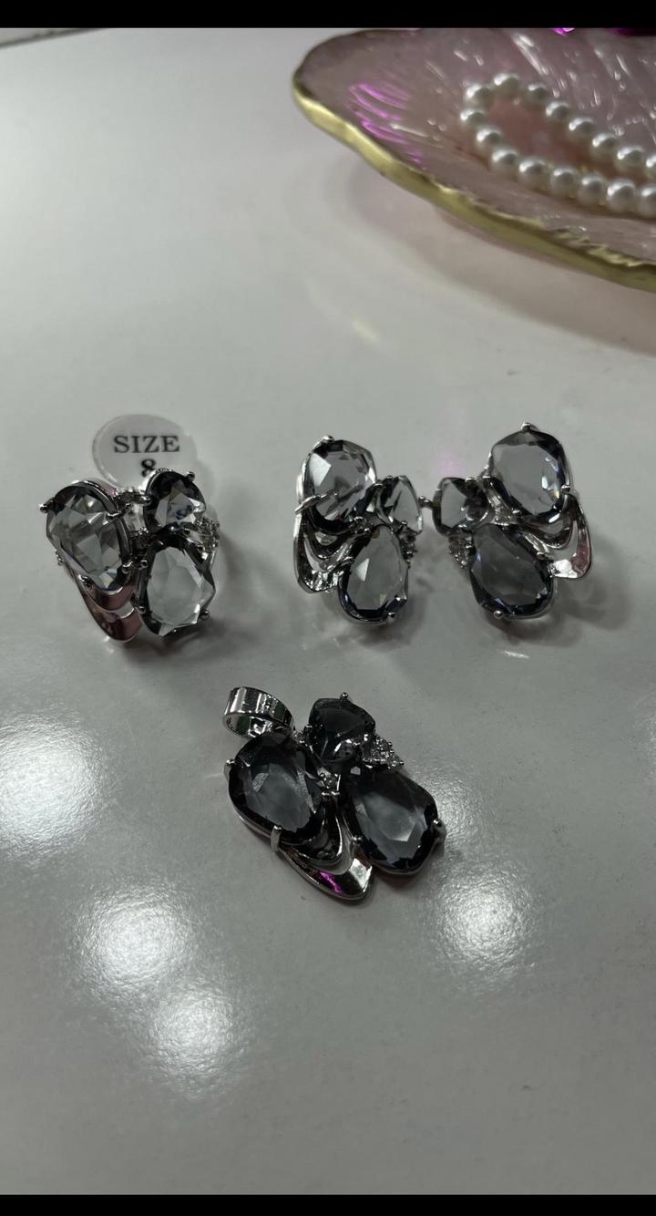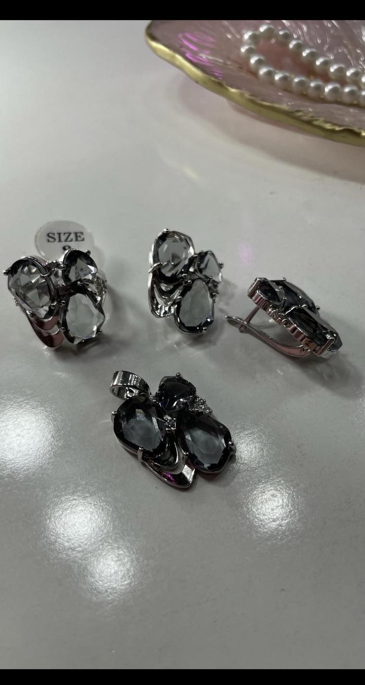 Гарнитур: темно серые кристаллы Кольцо -18 размер с этикеткой Серьги Кулон Новое в коробочке красивой отправлю можно на подарок Стоит гравировка 925 проба Артикул: 383453