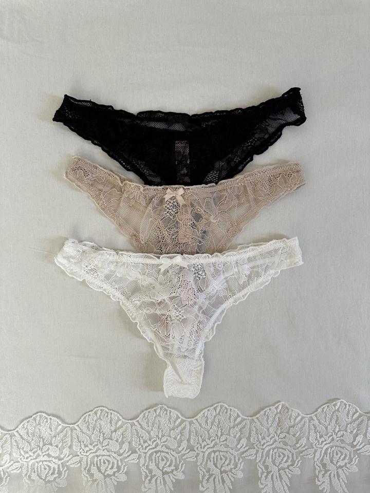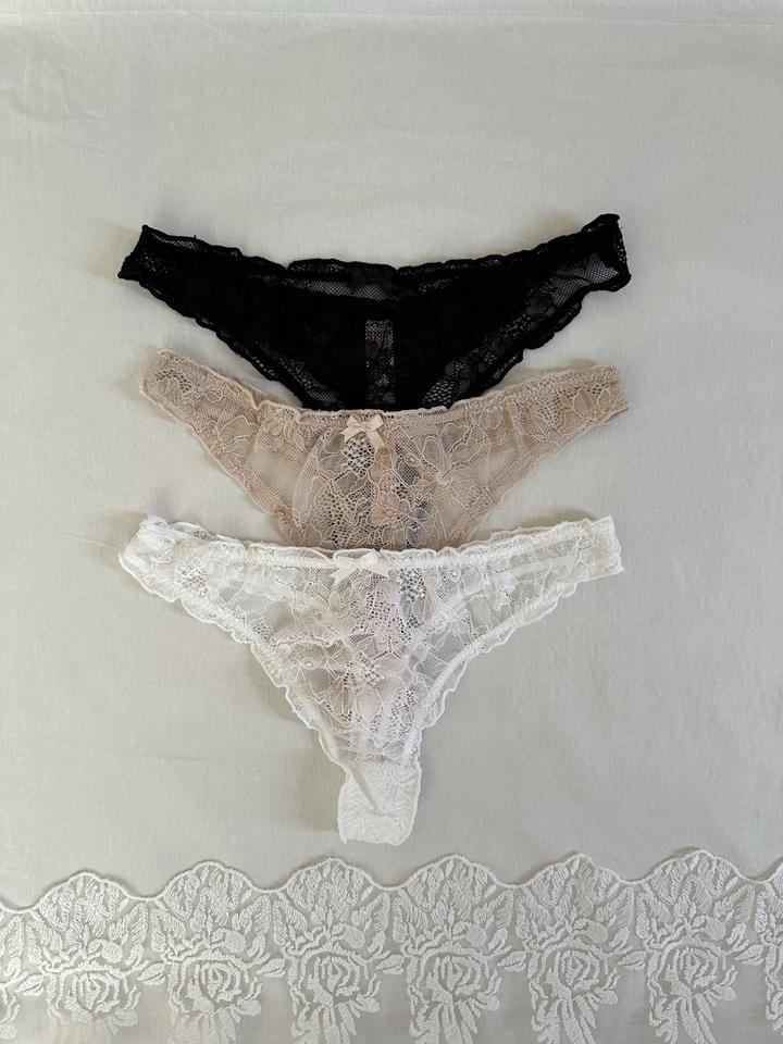 Набор женских кружевных трусов-стрингов (3шт) Цвет: Белый, бежевый, черный Материал: 84% нейлон + 16% спандекс Ластовица: 95% хлопок + 5% спандекс Размеры: S-L (40-48) Артикул: 383601