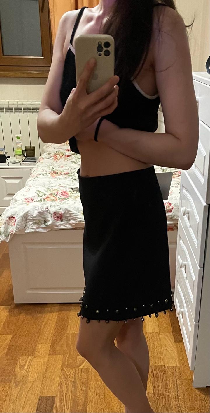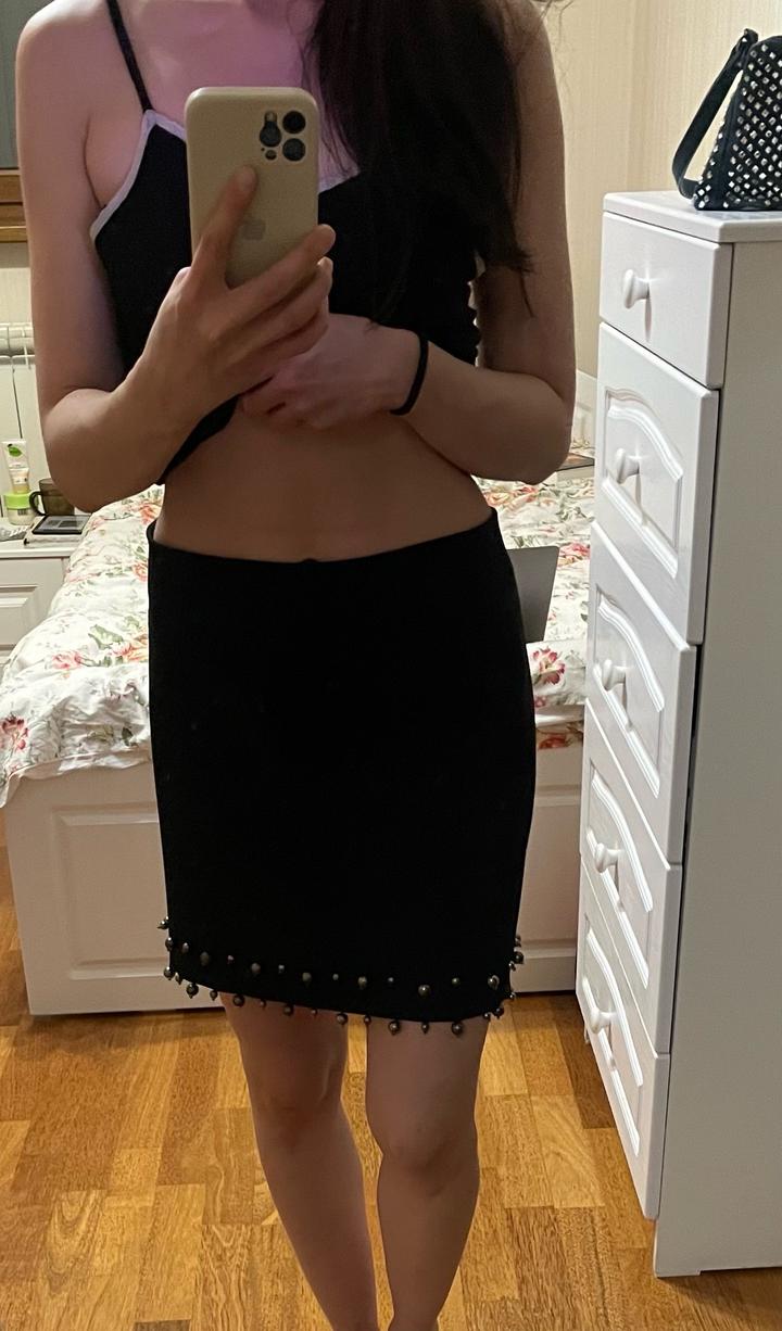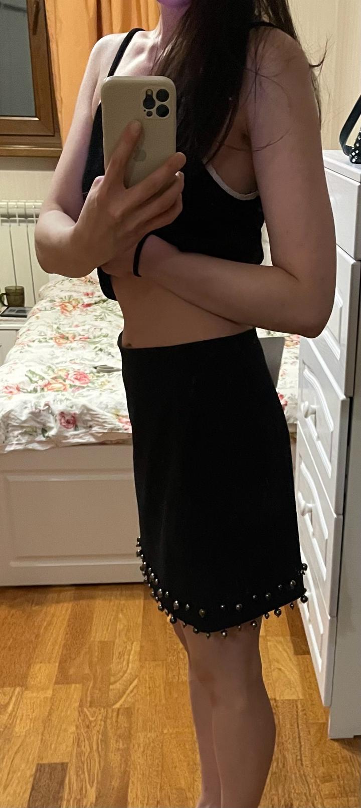 Темно-синяя юбка с бусинами выше колена, но не слишком короткая. Вполне уместна для офисных луков. Размер XS, но на XS сидит свободно, на S будет как раз. Артикул: 384407