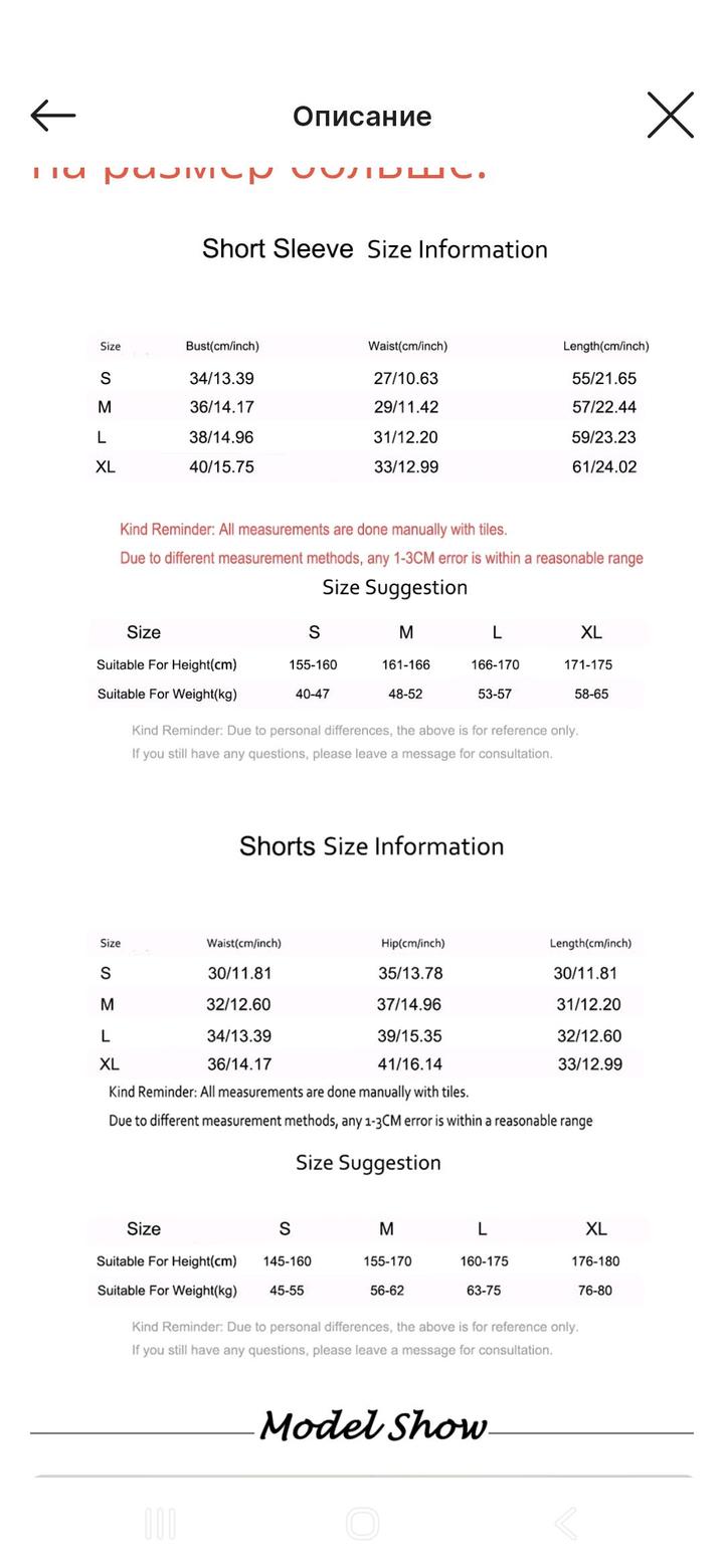 По меркам на фото смотреть размер L. По нашим меркам это m. Шорты + Футболка. Цвет: vany blue (темно-синий) В шортах есть небольшой кармашек. Приятный на ощупь, красиво сидит по фигуре. Не подошел размер, буду перезаказывать. Для йоги, спортзала и другой активности. Артикул: 389284