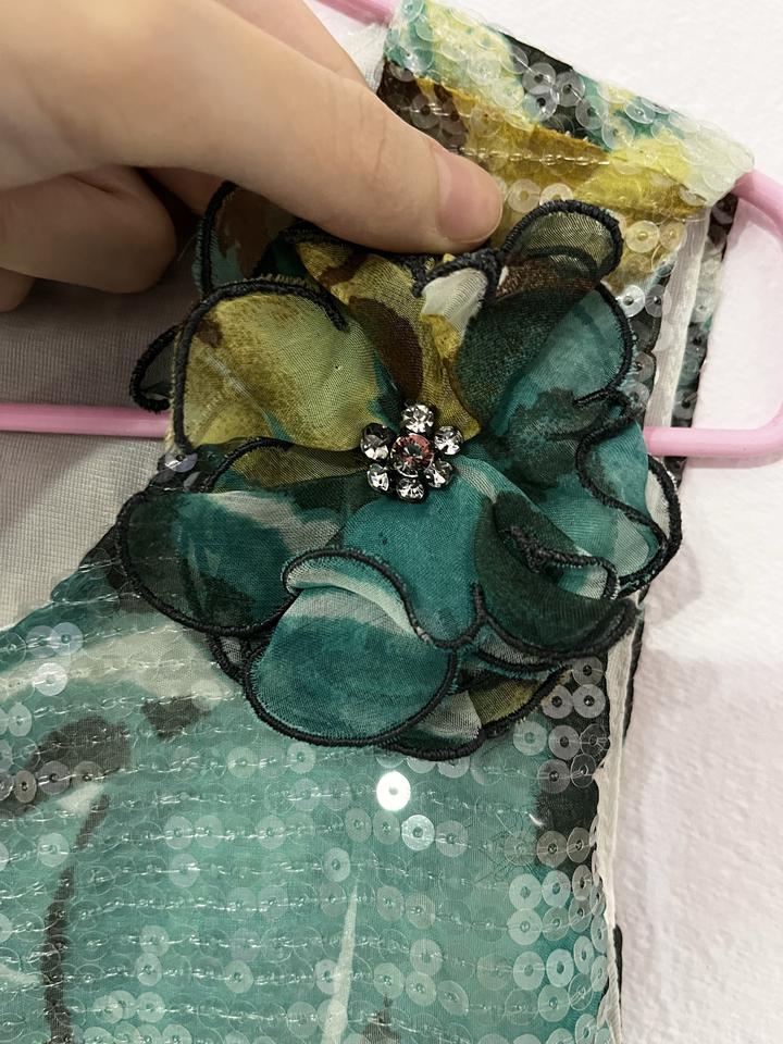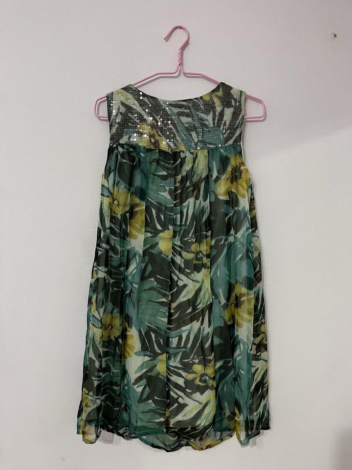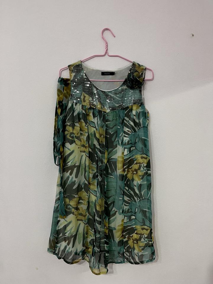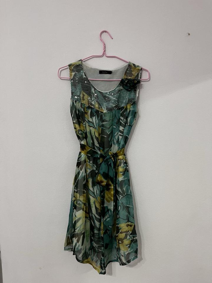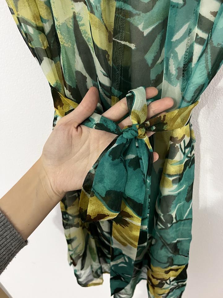 Зеленое платье с цветочными узорами. Рост девушки на фото 171. Есть повязка в качестве ремня доя платья. Легкое и воздушное. Малайский бренд. Купили в Малайзии, носили пару раз. Артикул: 391238