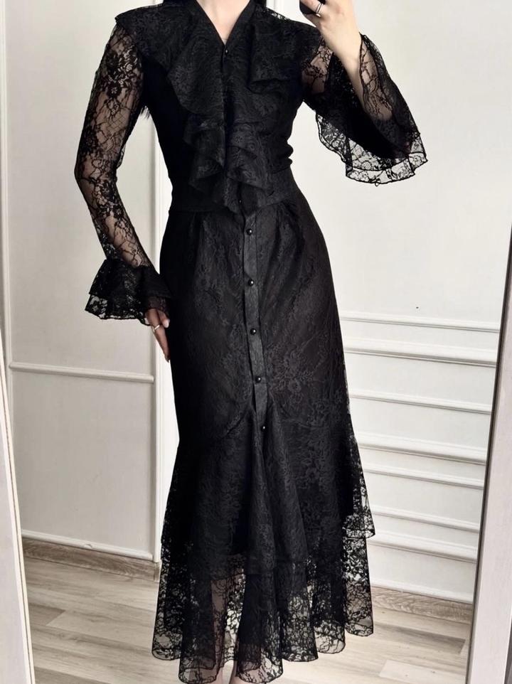 Женское кружевное платье. Длина: макси Рукава:длинные Пуговицы:рабочие Вырез:V- образный с волнами Одевалось на свадьбу, состояние очень хорошее Артикул: 392610