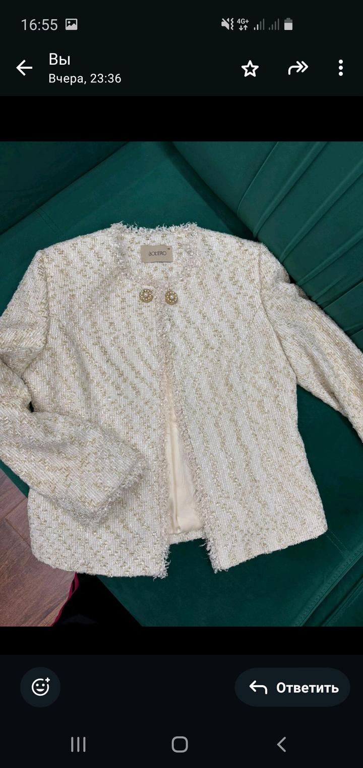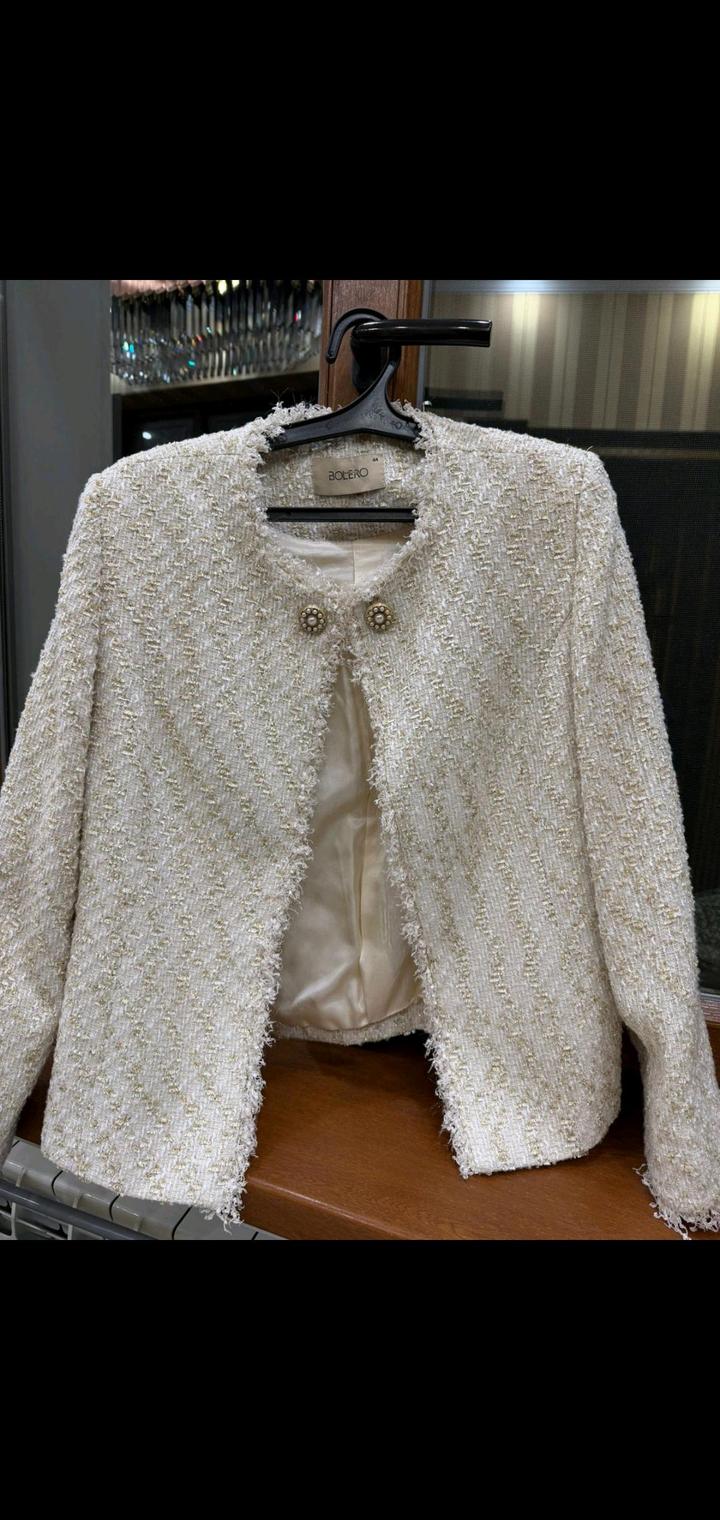 Элегантный женский костюм двойка от фирмы Bolero пиджак + юбка. Размер: 44 Материал: твид (букле) Цвет: молочный / айвори с золотистой нитью Состояние: отличное Костюм в стиле Chanel, смотрится очень стильно и дорого. Пиджак с аккуратной посадкой, юбка классического кроя. Отлично подойдёт для торжеств, работы, мероприятий или повседневной носки. Без пятен и повреждений Носился аккуратно 1 раз,новые. Артикул: 393129