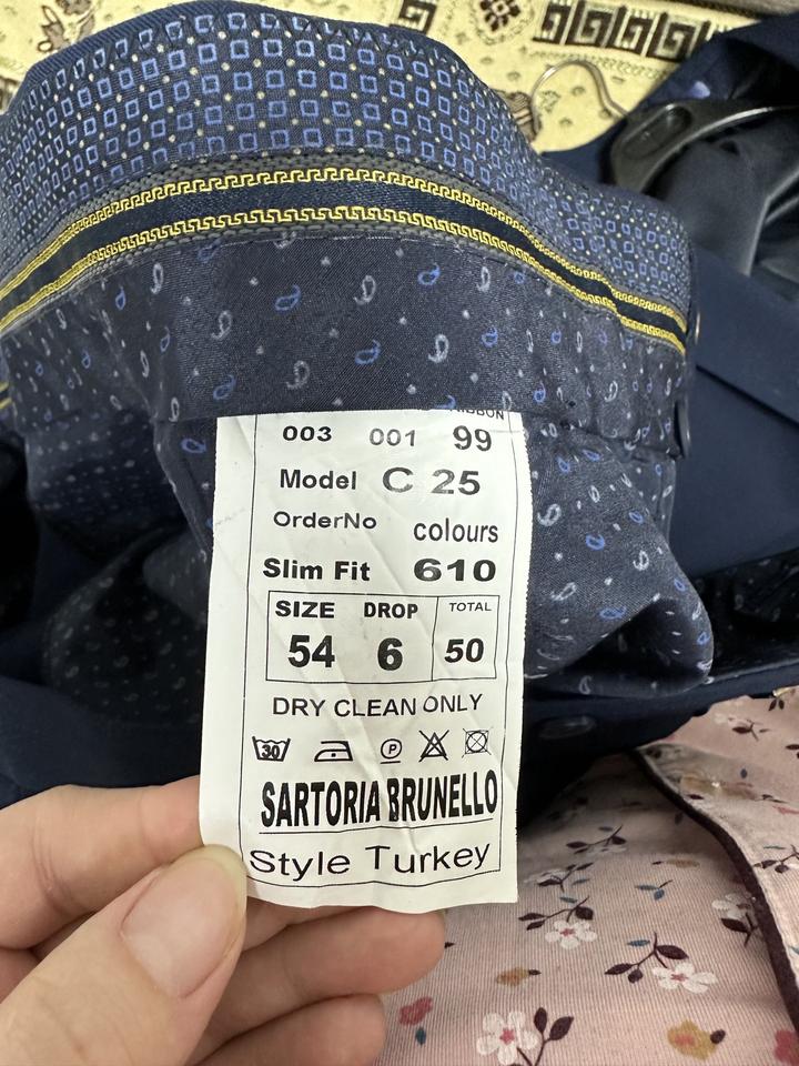 Детали продукта Бренд: Sartoria Brunello Страна-производитель: Турция Посадка: Slim Fit Размер: 54 DROP 6 TOTAL 50 (международный размер 44) Артикул: 393708