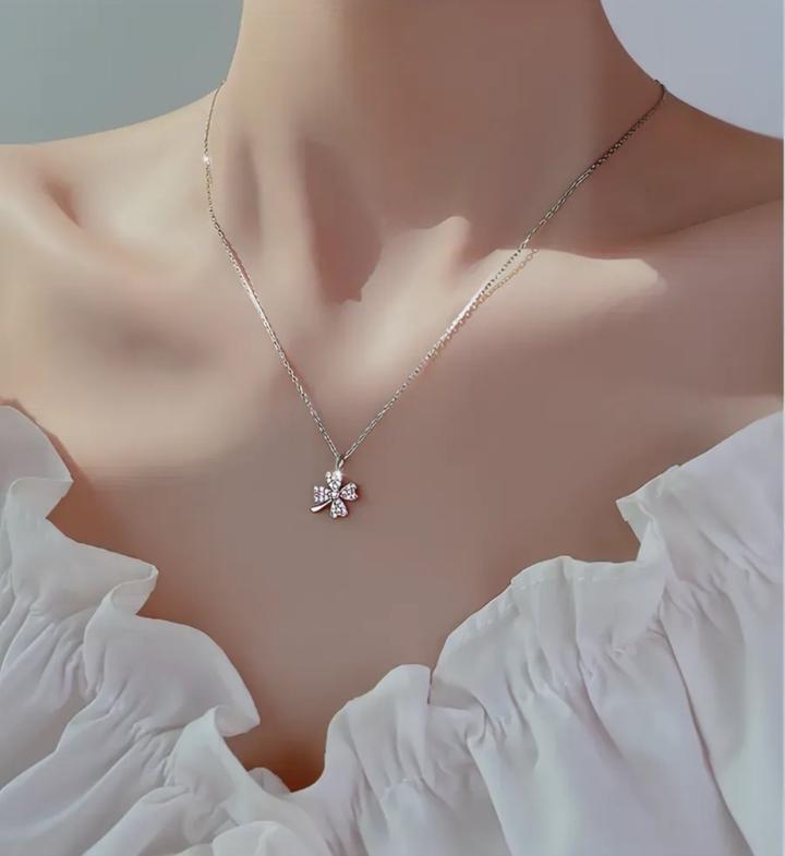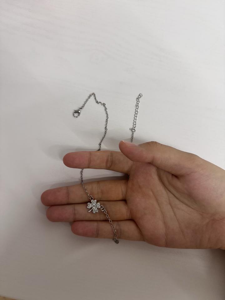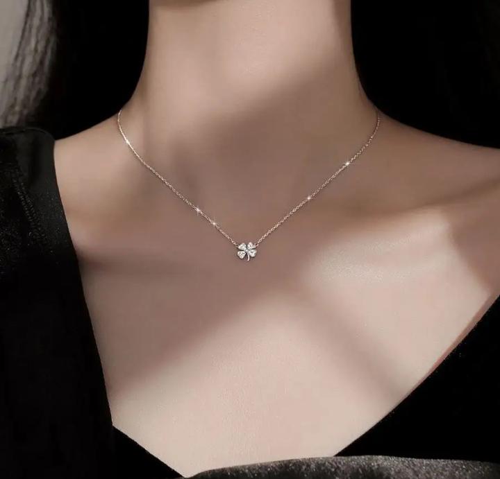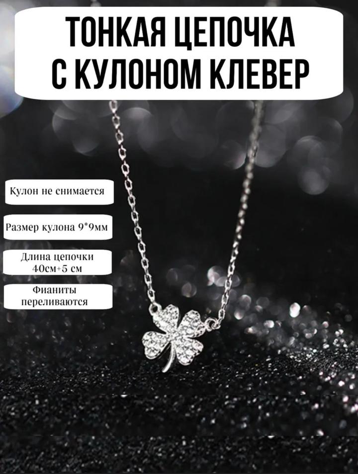 Тонкая серебряная цепочка с кулоном клевер переливающаяся-