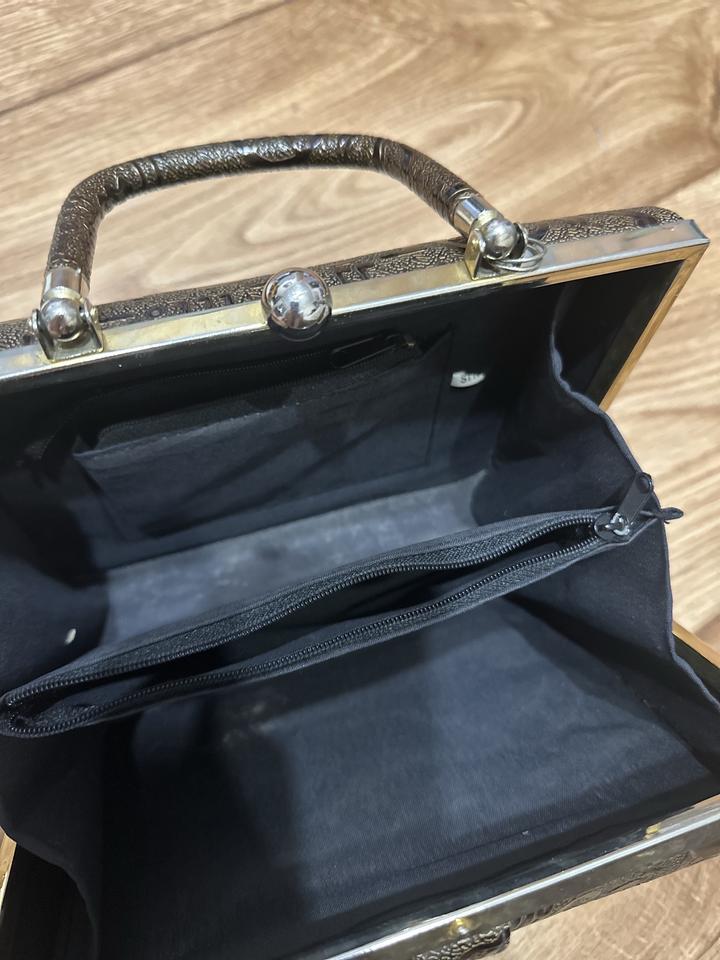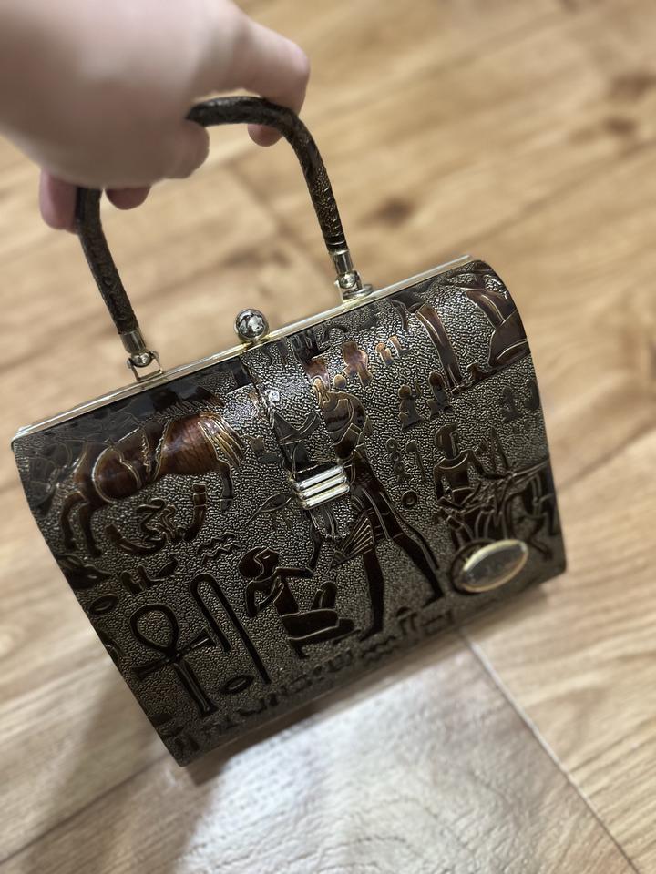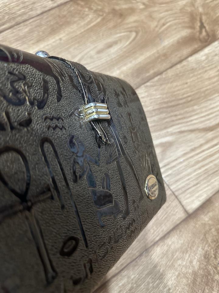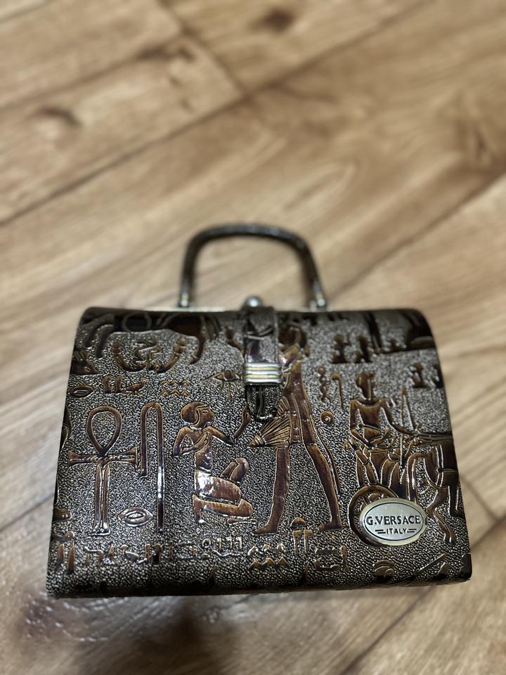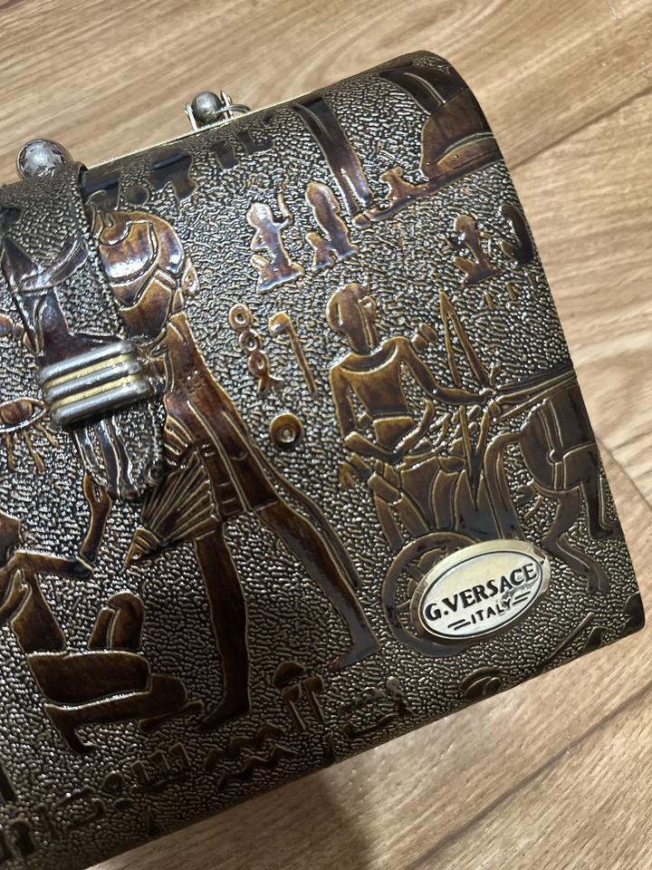 Винтажная сумка Versace жёсткой формы с короткой ручкой. Декорирована выразительным тиснением с фигурами в египетском стиле, отсылающими к культовым мотивам бренда. Металлическая рамка с замком-клик подчёркивает ретро-характер модели. Глубокий коричнево-бронзовый оттенок, эффект благородной патины. Акцентный аксессуар для стильных образов и коллекционеров. Артикул: 395060