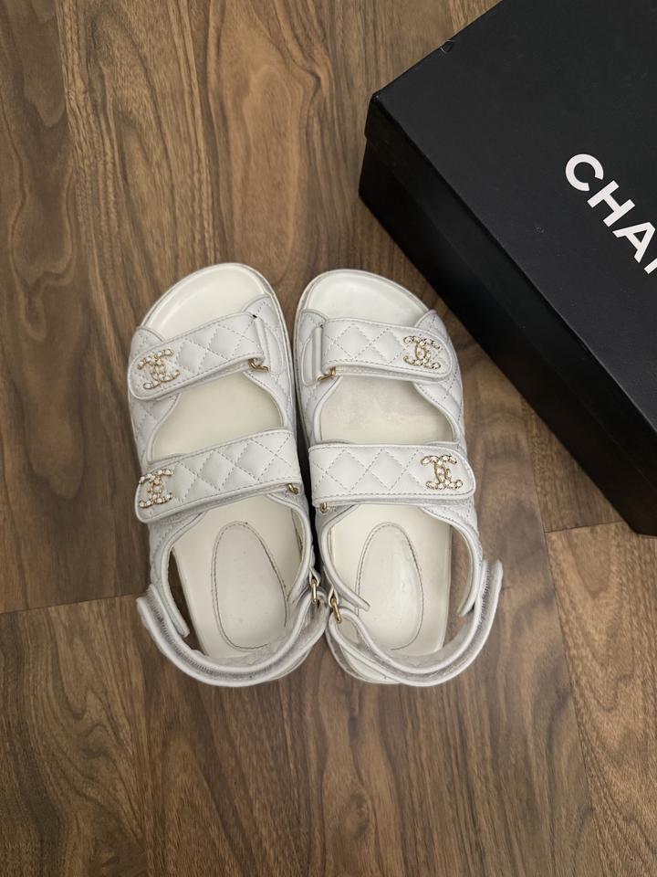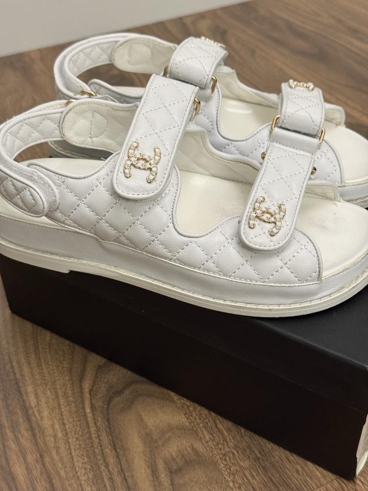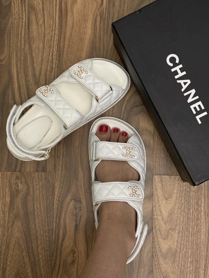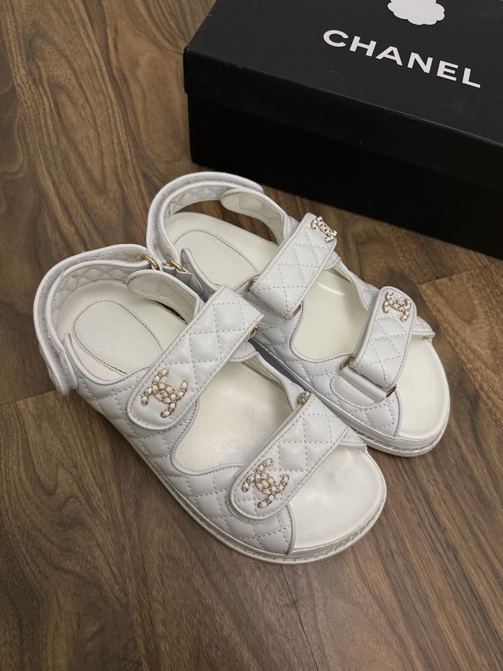 Белые сандалии Chanel. Реплика Носила 1 раз. В хорошем состоянии. Возможно есть следы носки и использования. Все фото живые. Размер 38 На липучках. Можно регулировать. Полная упаковка: коробка , пыльник, документы. На лето самое то. Артикул: 396904