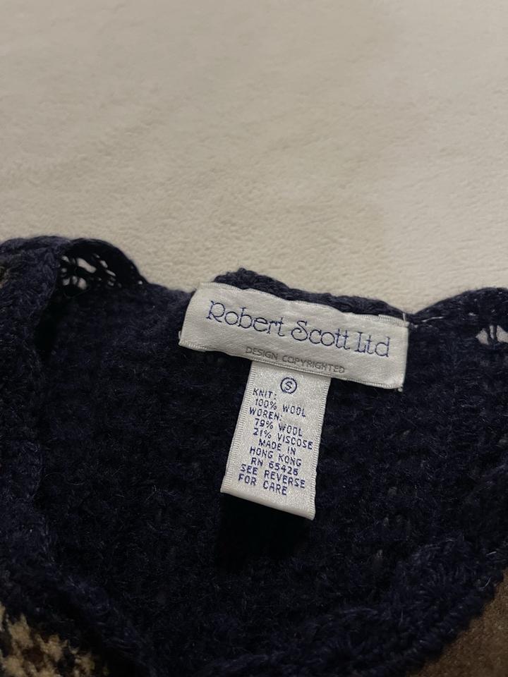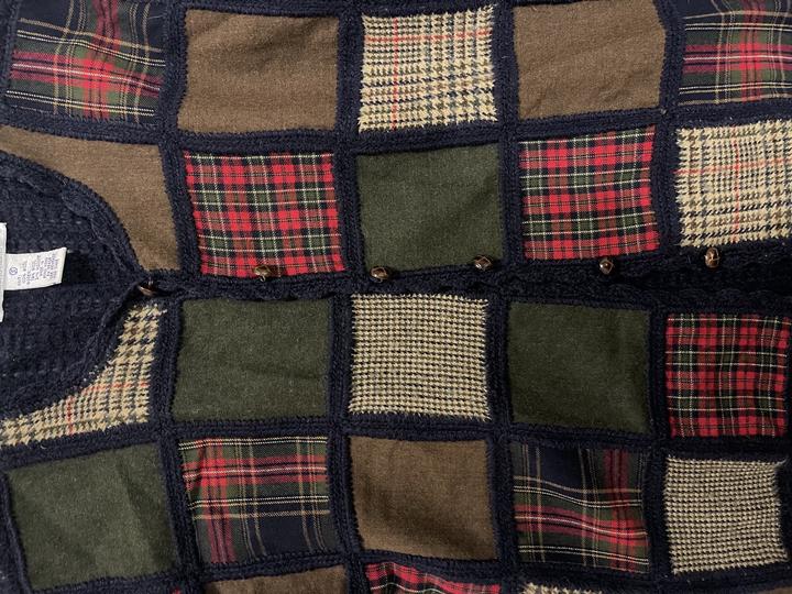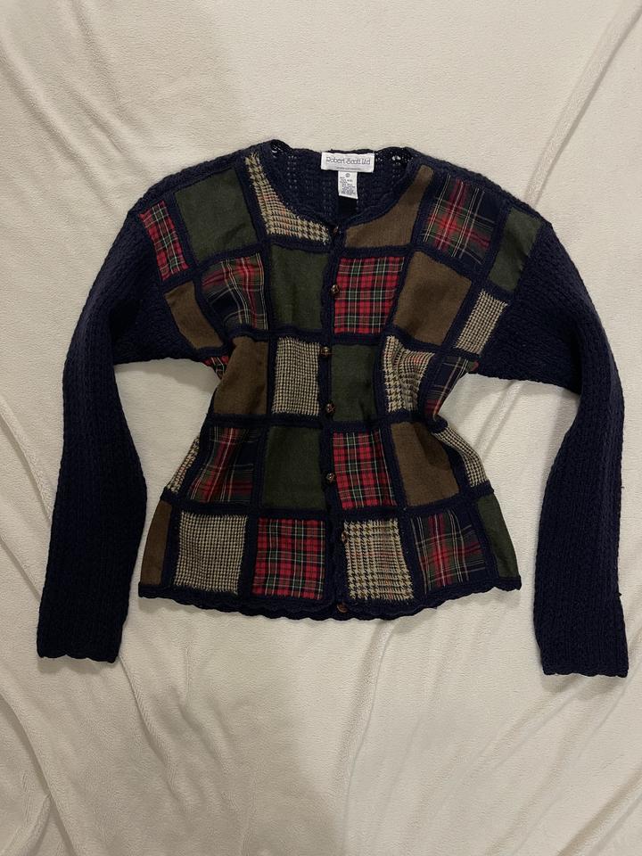 Оригинальный винтажный кардиган от Robert Scott Ltd с лоскутным дизайном (patchwork). Редкая модель с сочетанием клетчатых тканей и плотной вязки — выглядит дорого и атмосферно. • бренд: Robert Scott Ltd • дизайн: patchwork / quilt style • состав: 100% шерсть (основное полотно), вставки из шерстяных тканей • тёплый, плотный, отлично держит форму • аккуратные пуговицы • сделан в Hong Kong (винтажное производство) Состояние: отличное, без дефектов Артикул: 399782
