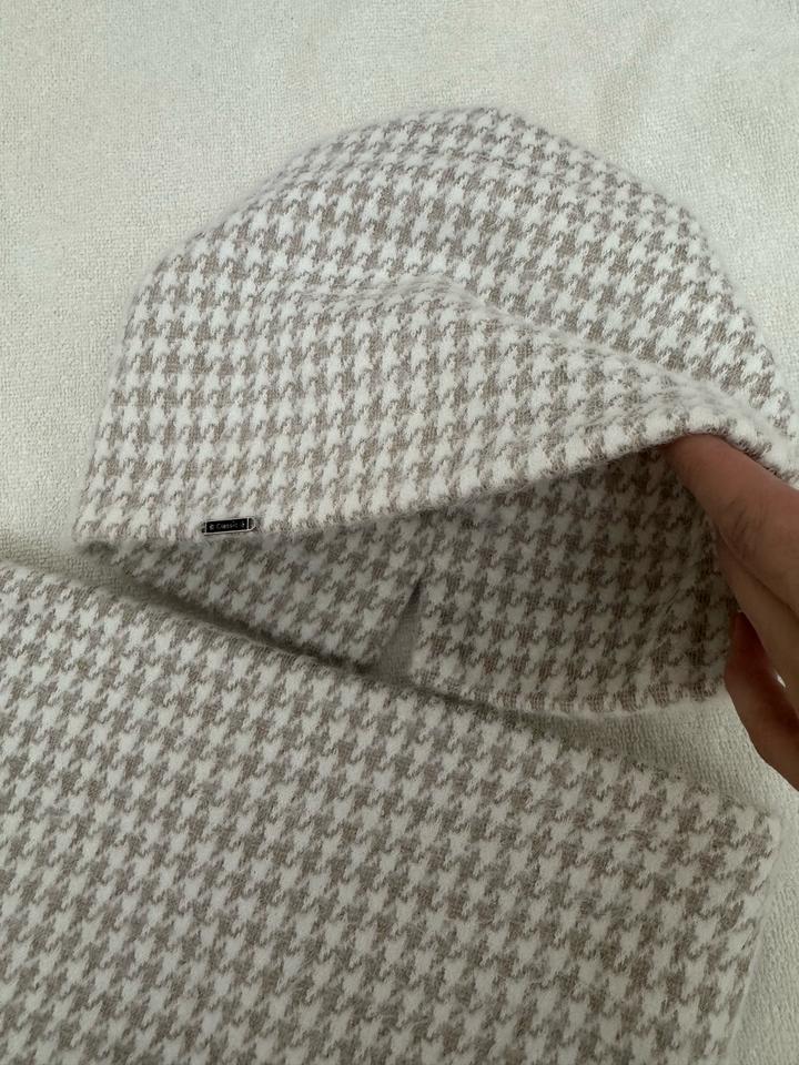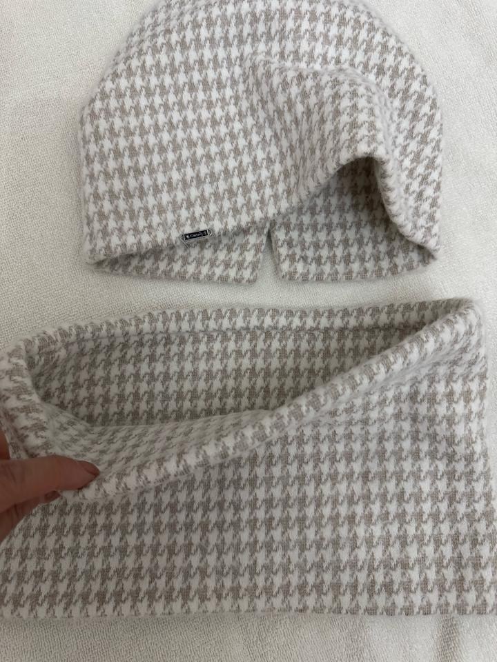 Стильный тёплый комплект из шапки и снуда в нежном бежево-молочном оттенке с узором «гусиная лапка». Мягкий, приятный к телу материал, хорошо держит форму, не колется. Отлично защищает от холода и ветра, смотрится аккуратно и дорого. Подходит под классическую и повседневную верхнюю одежду. Состав: 10% шерсть, 90% акрил. Без пятен и дефектов. Состояние отличное. Артикул: 400667