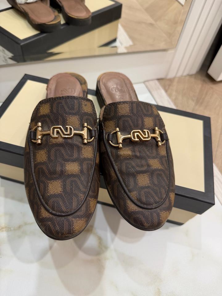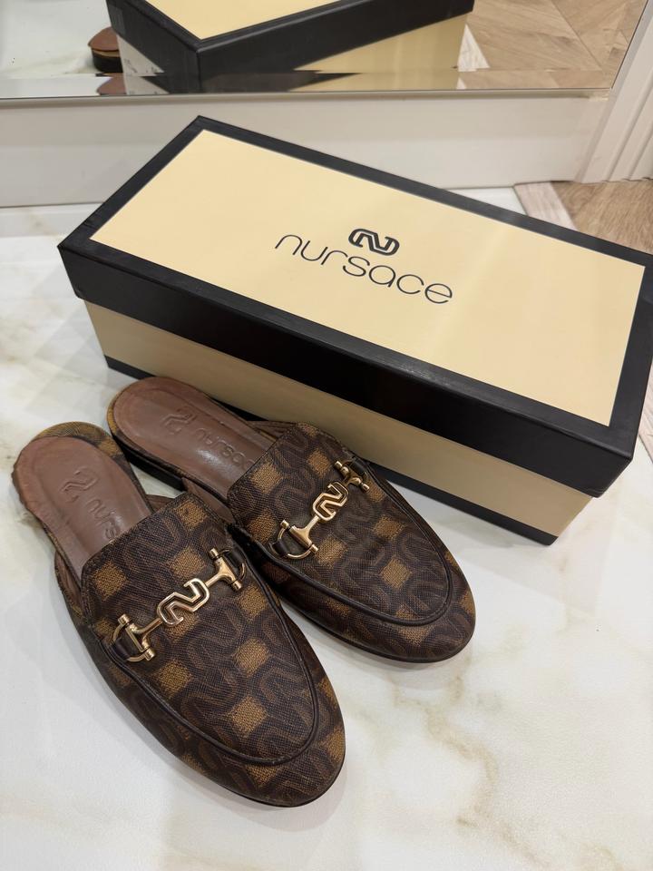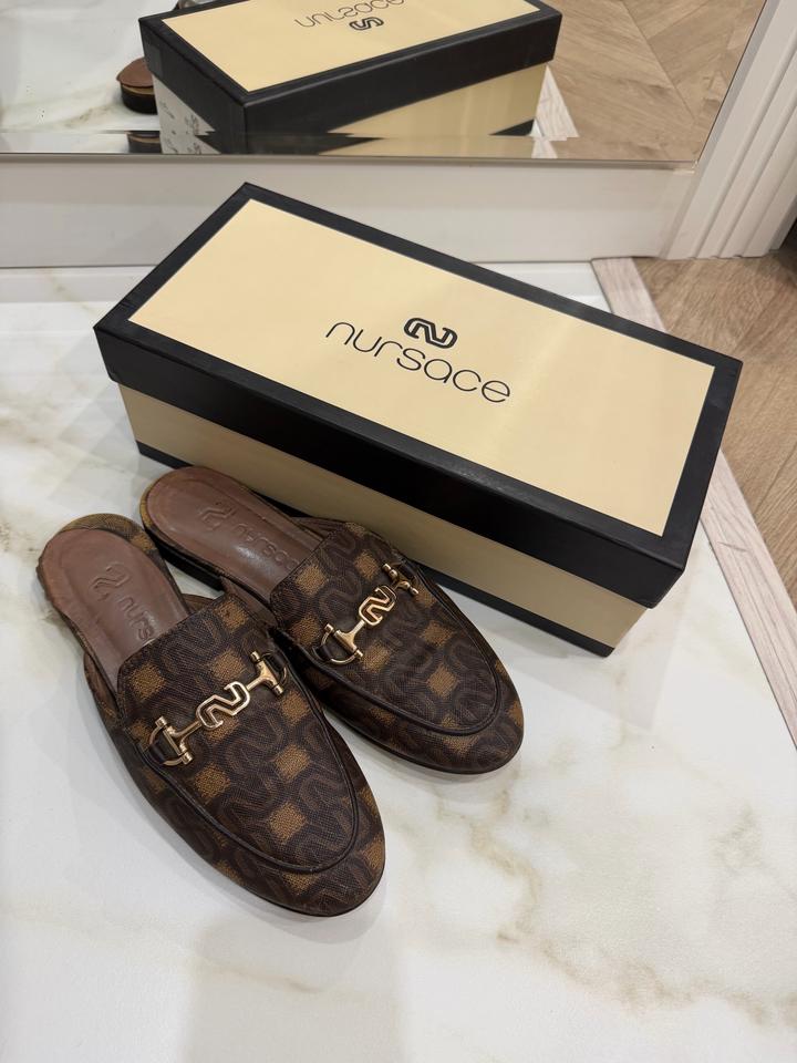 Коричневые мюли от Nursace , очень удобные Есть следы носки Есть внутренние дефекты Артикул: 401110