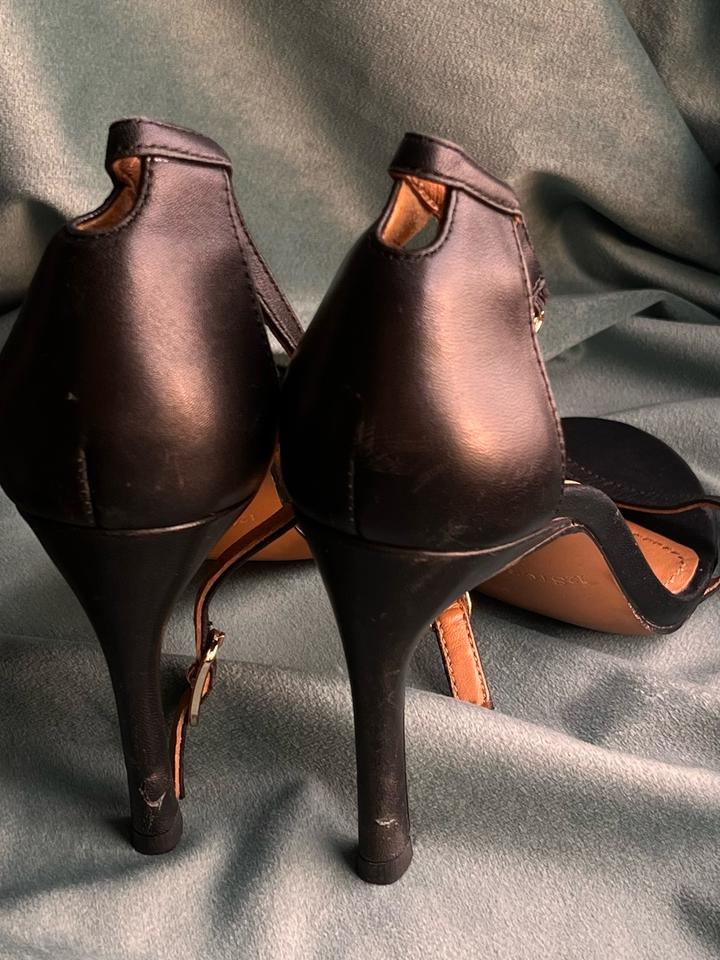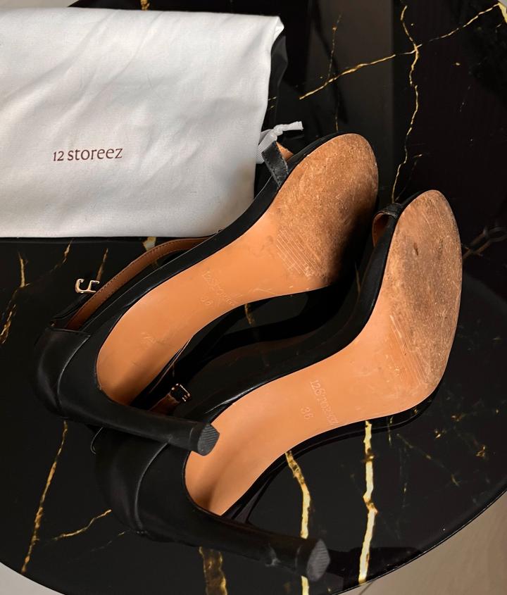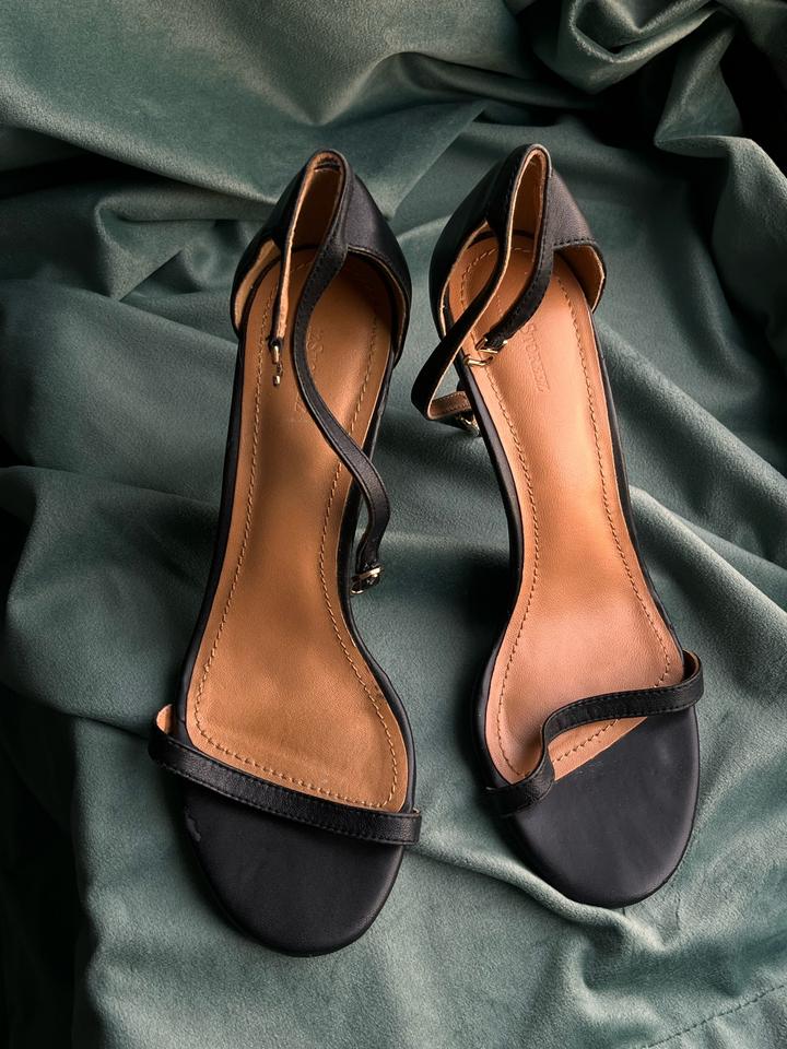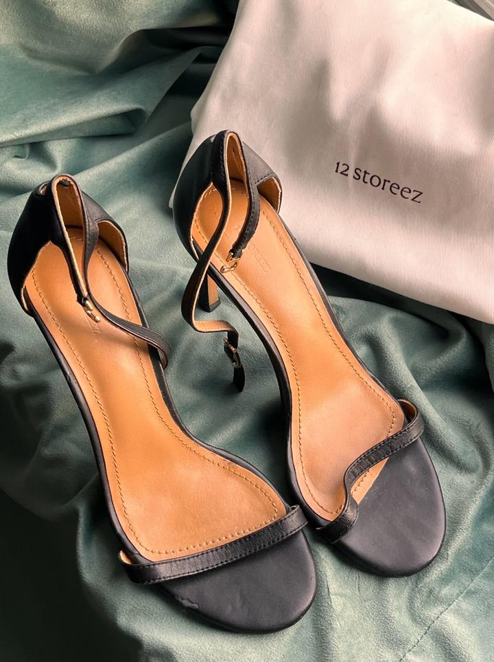 Черные кожаные босоножки 12storeez. Есть пара нюансов на каблуке, видны следы носки, на последних фото. А так супер качественные, очень красиво смотрятся, аккуратно и нежно Артикул: 401936