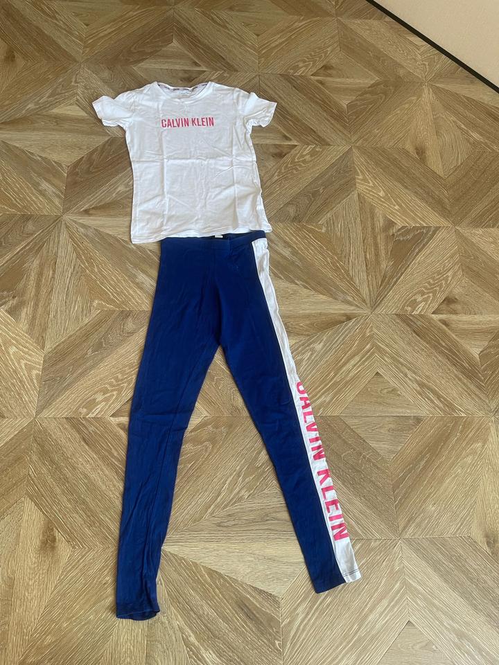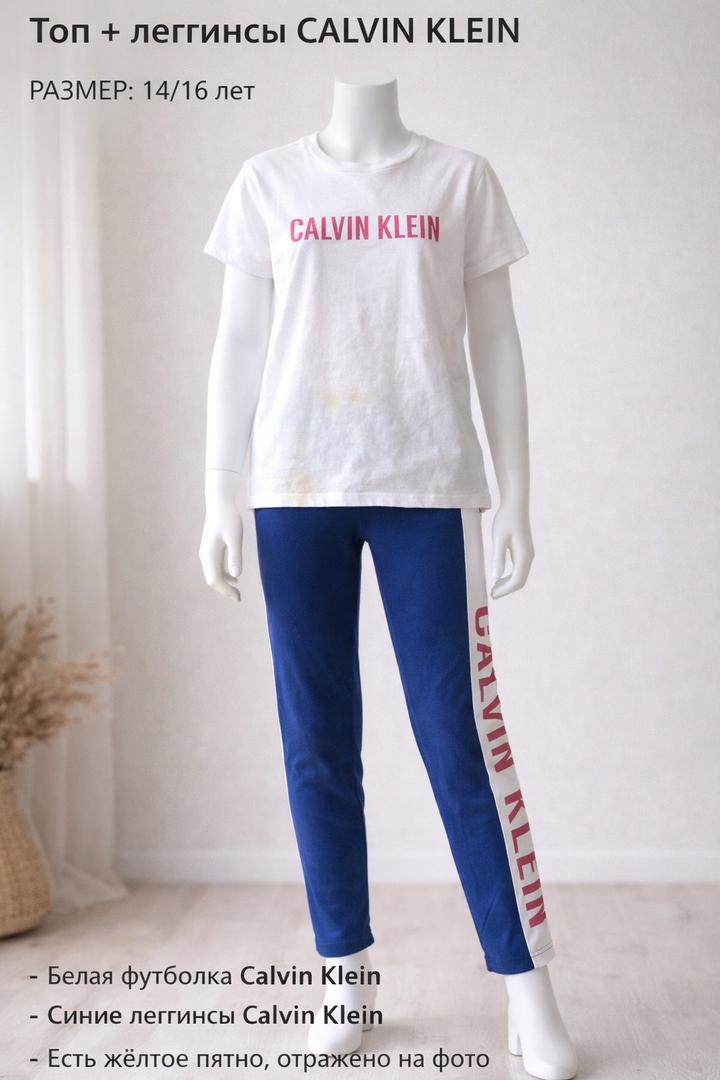 Детский комплект Calvin Klein Футболка + леггинсы Стильный спортивный комплект от CalvKlein удобный вариант для повседневной носки, прогулок и активных дней. Есть жёлтоватое пятно на футболке — чётко видно на фотографиях, специально не скрывалось, можно вывести Артикул: 404978