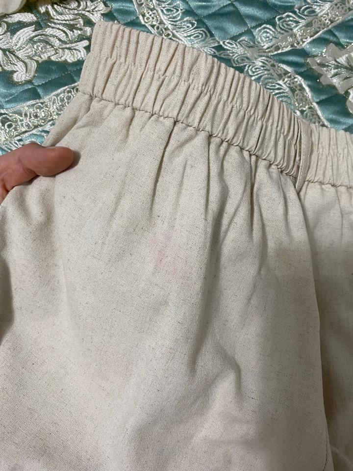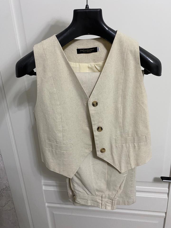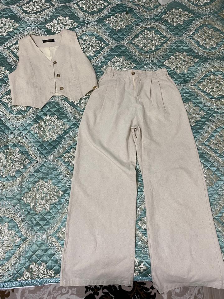 Двойка из лёна M/L. Подойдет для высоких девушек. Молочный цвет. Носилось пару раз. На брюках, сзади у пояса небольшое розовое пятно. Артикул: 405522