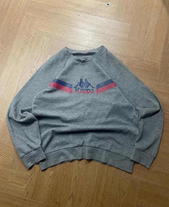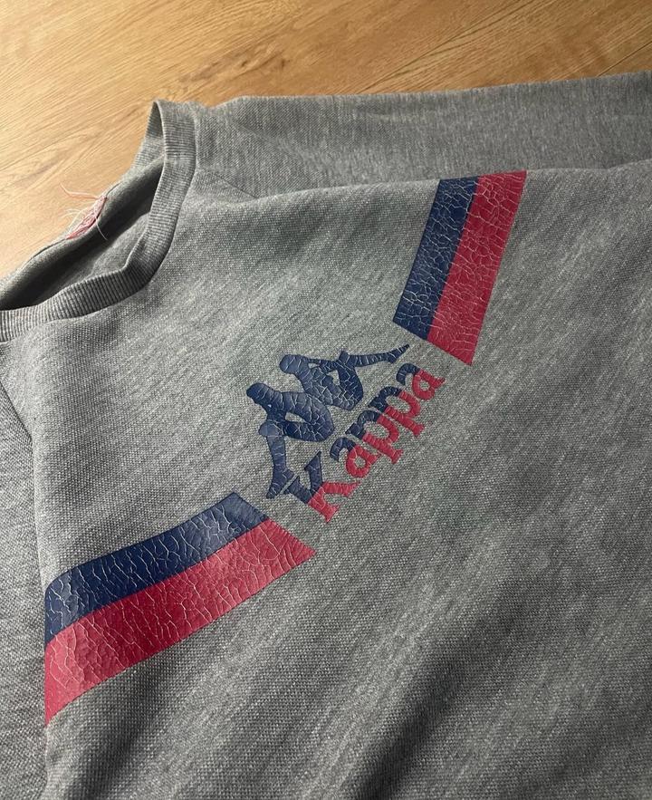 Серая кофта от бренда Kappa, принт так и задуман он не стерт, состояние хорошое, бирки отрезаны. но брал их новыми и в бутике Артикул: 405943