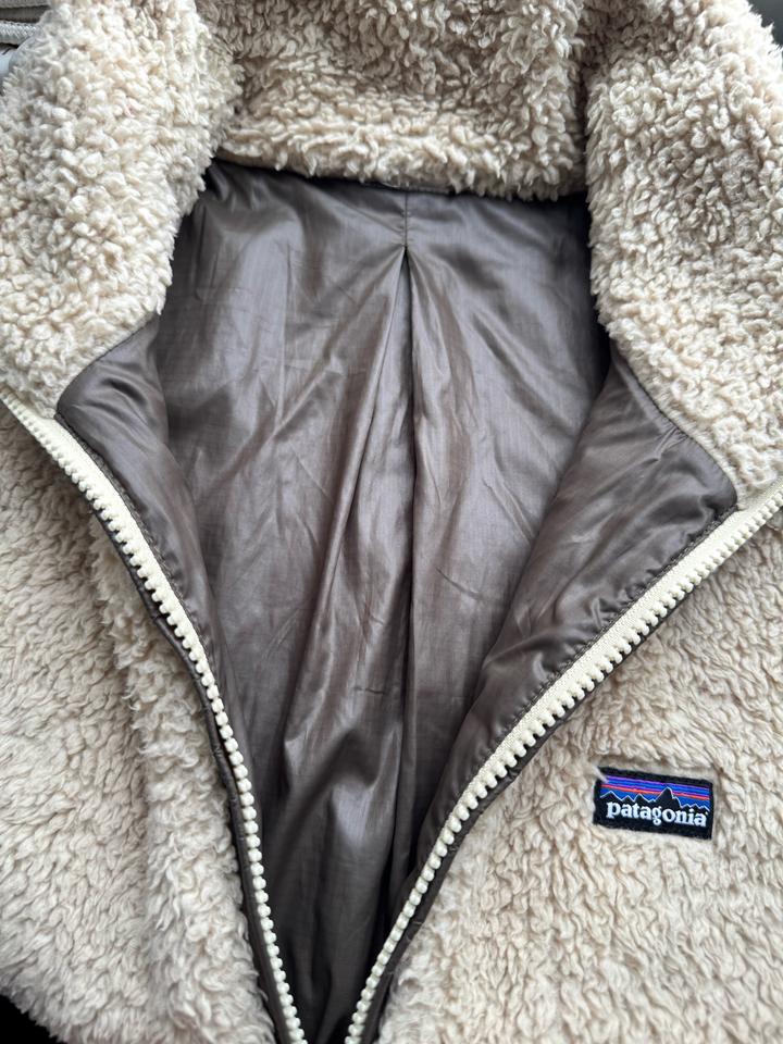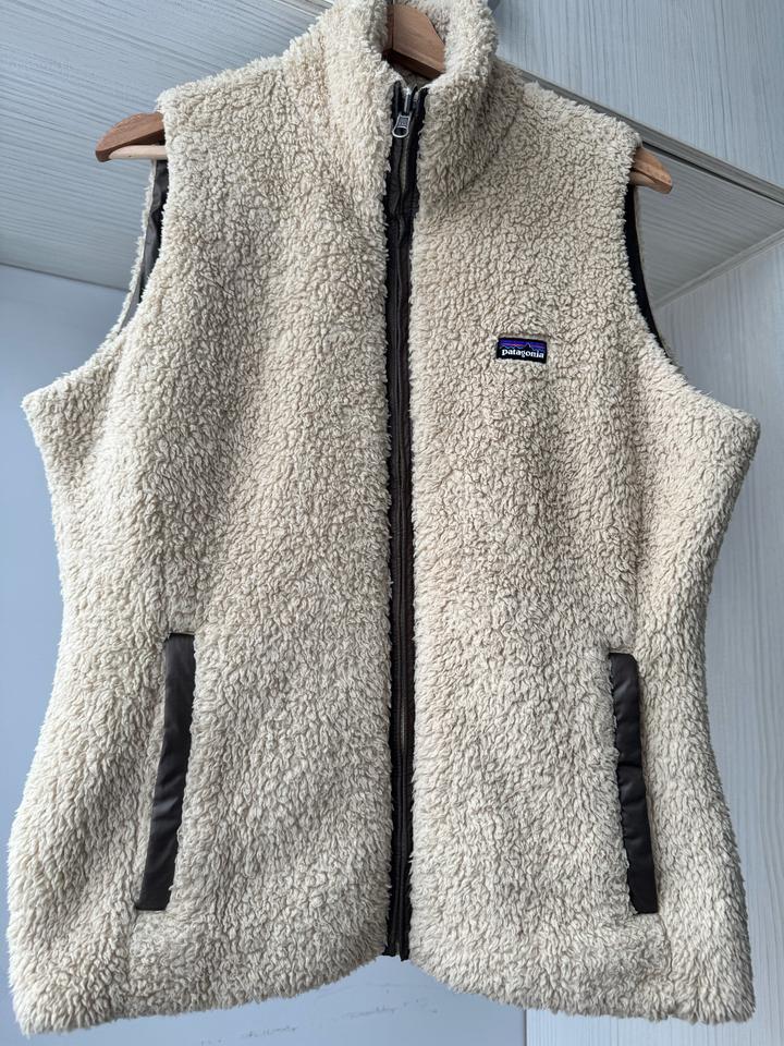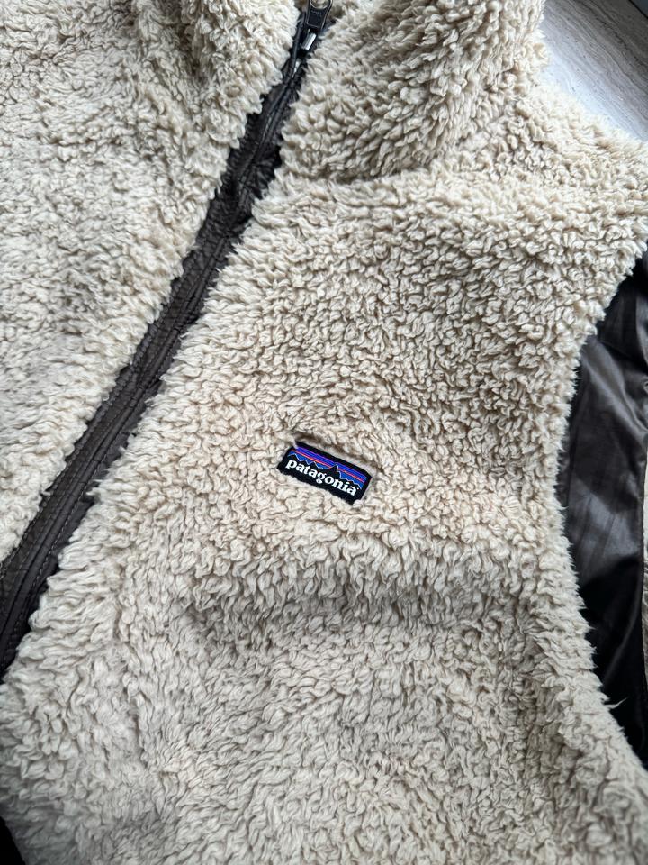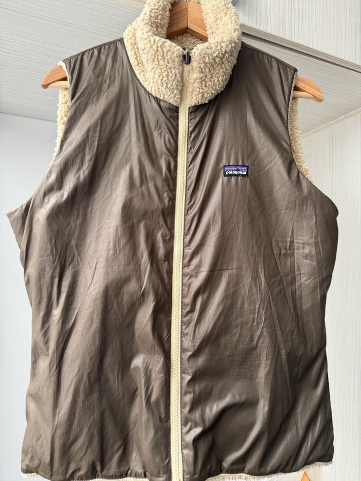 Женский жилет Patagonia. Двусторонний жилет из флиса шерпа, широко известный как жилет Los Gatos. Размер: L, 46-48 ( ширина 50, высота 64) Цвет: слоновая кость/коричневый Артикул: 405985