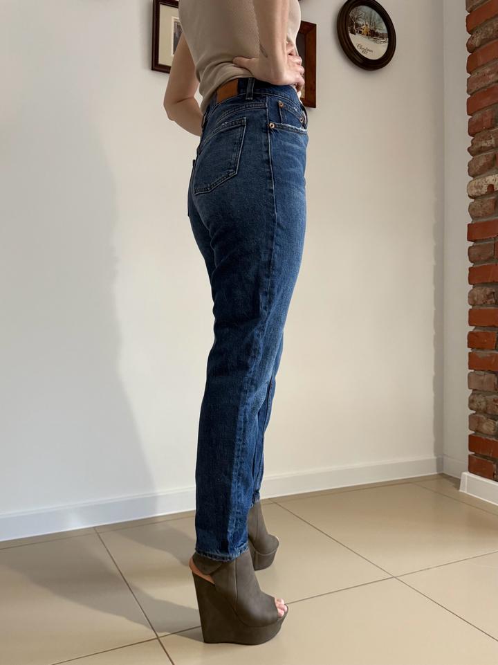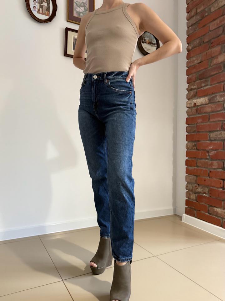 Мом джинсы темно синие на высокой посадке. В идеальном состоянии, надевались лишь пару раз. Размер 34, что соответствует размеру XS Должны сидеть свободно, мне сейчас в обтяг, к сожалению. После беременности изменился размер)) Артикул: 407055