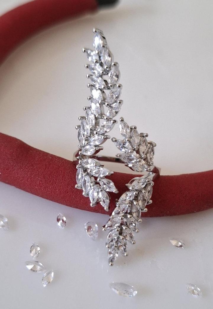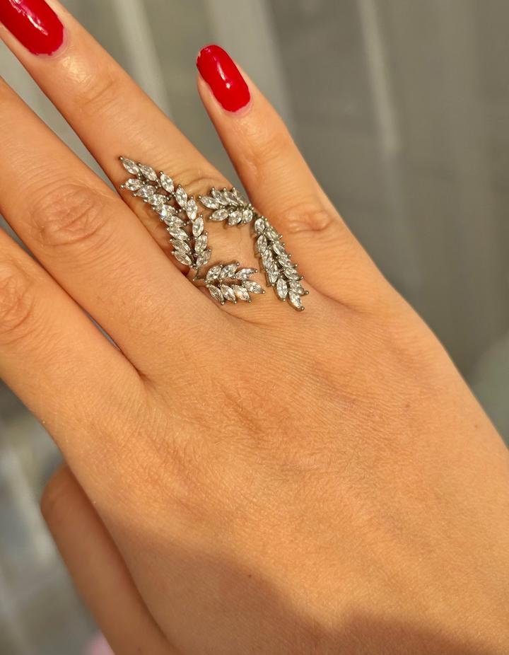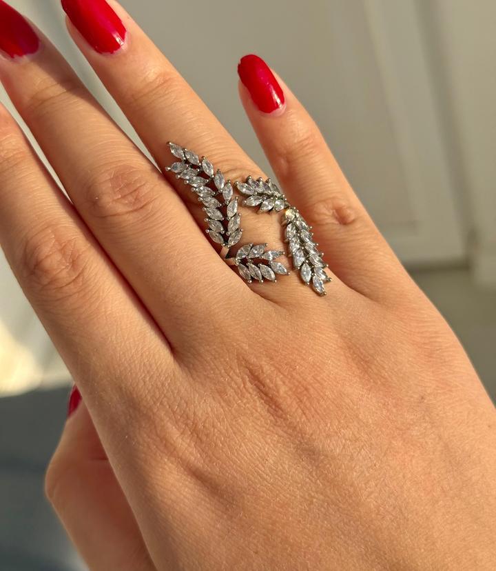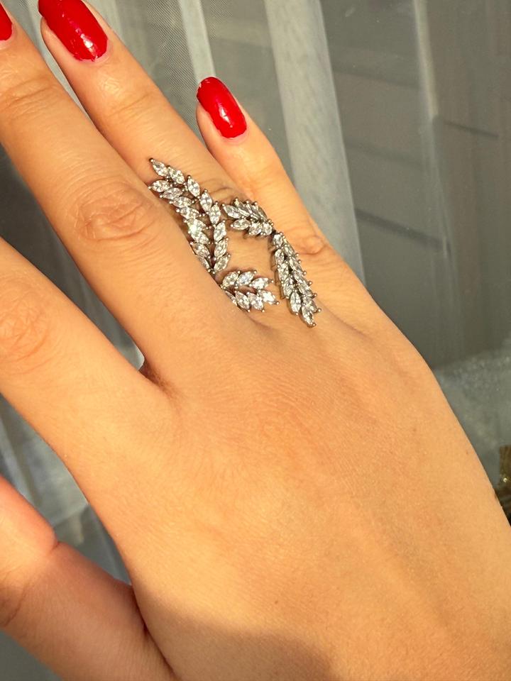 Кольцо в виде двух изящных веточек, усыпленных мелкими сияющими камнями. Выглядит нежно, женственно и делает руку визуально длинными. Носила один раз на вечер — без дефектов, состояние отличное. Размер: универсальный (регулируется) Aldo. Артикул: 407847