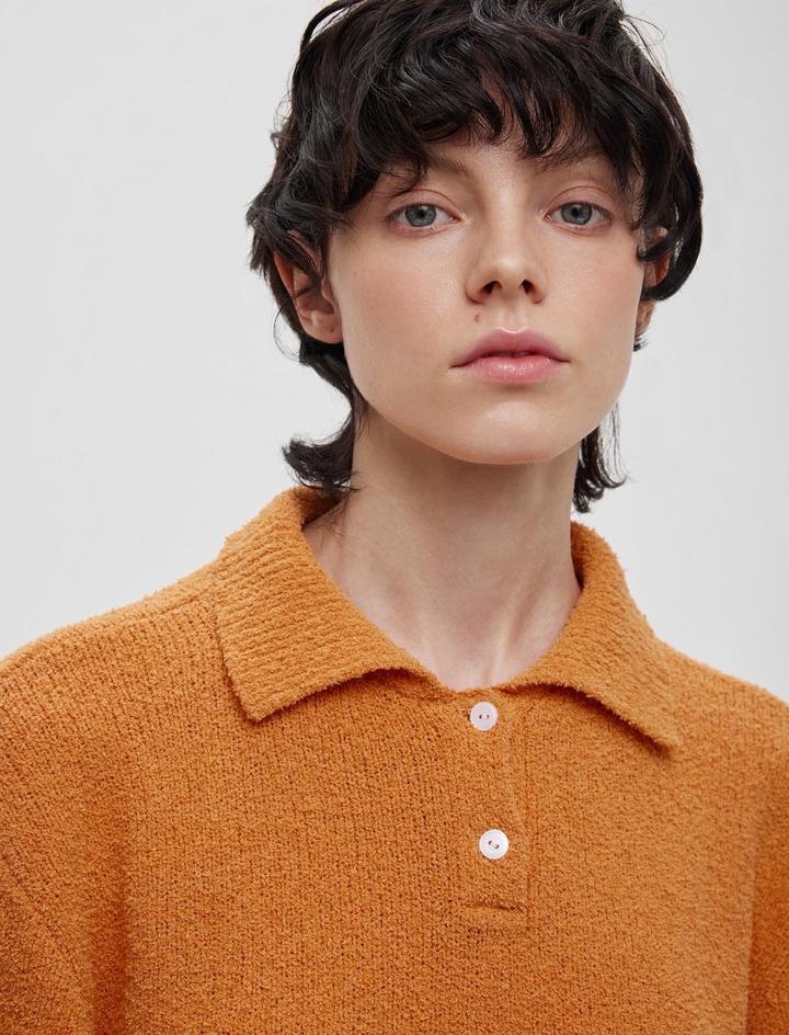 Поло с коротким рукавом, отложным воротником и застежкой на пуговицы по переду. Изготовлено из фактурной пряжи на хлопковой основе с эффектом букле. Артикул: 409875